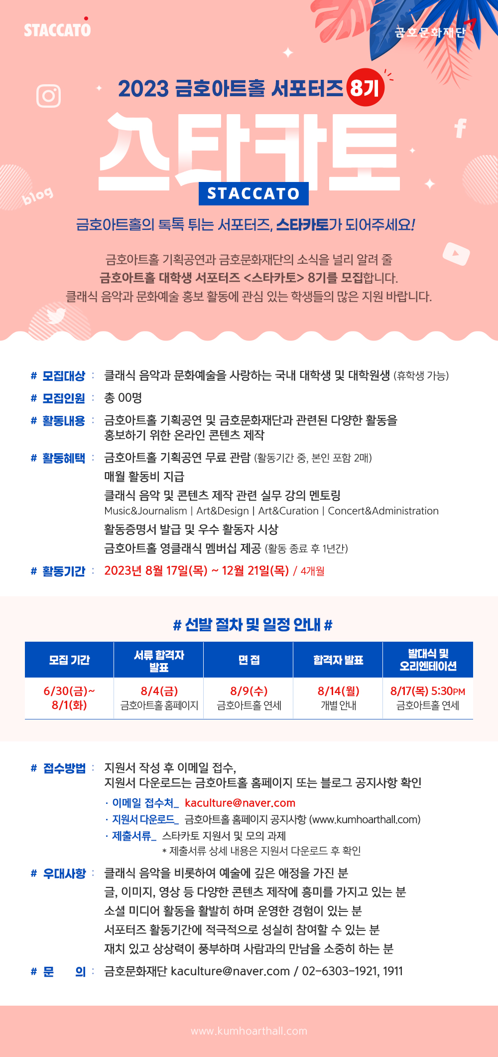 [금호문화재단] 금호아트홀 서포터즈 <스타카토> 8기 모집! (~ 8/1)