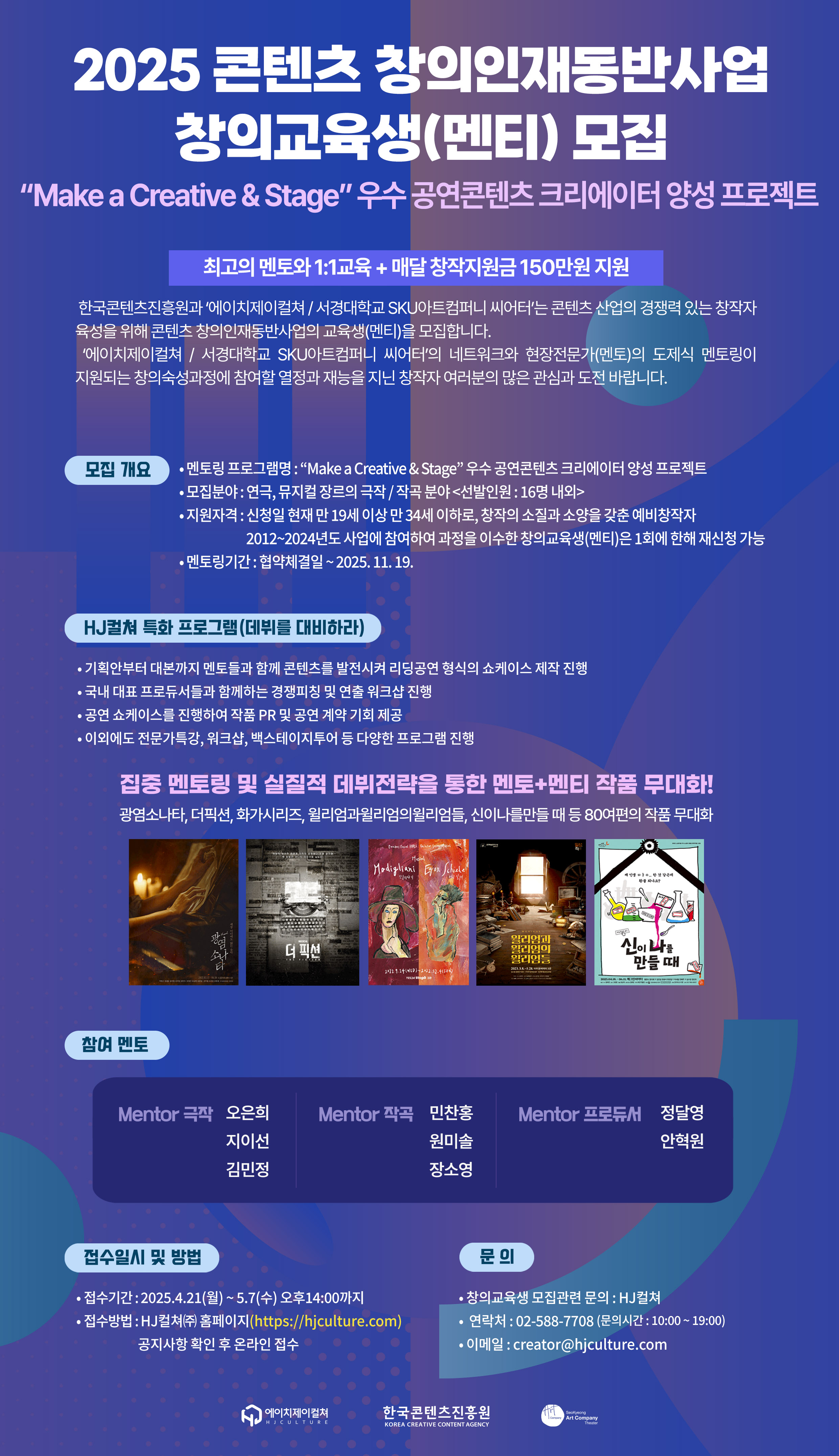 한국콘텐츠진흥원과 HJ컬쳐는 극작, 작곡 분야 창작자 육성을 위해 콘텐츠 창의인재동반사업의 교육생(멘티)를 모집합니다.