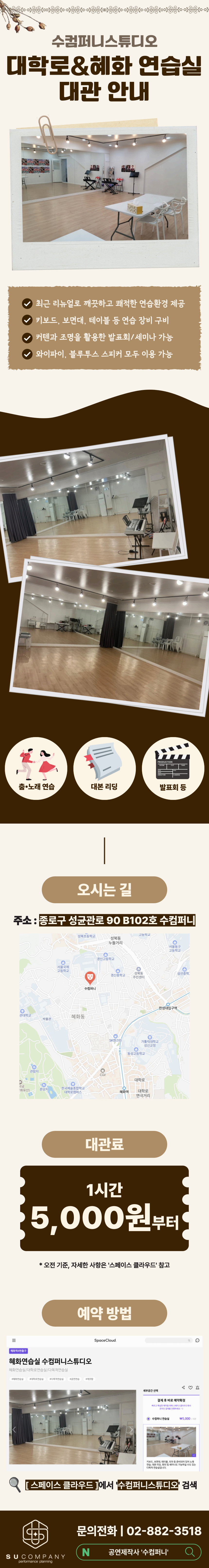 안녕하세요, 대학로 다목적 연습실 수컴퍼니스튜디오입니다.