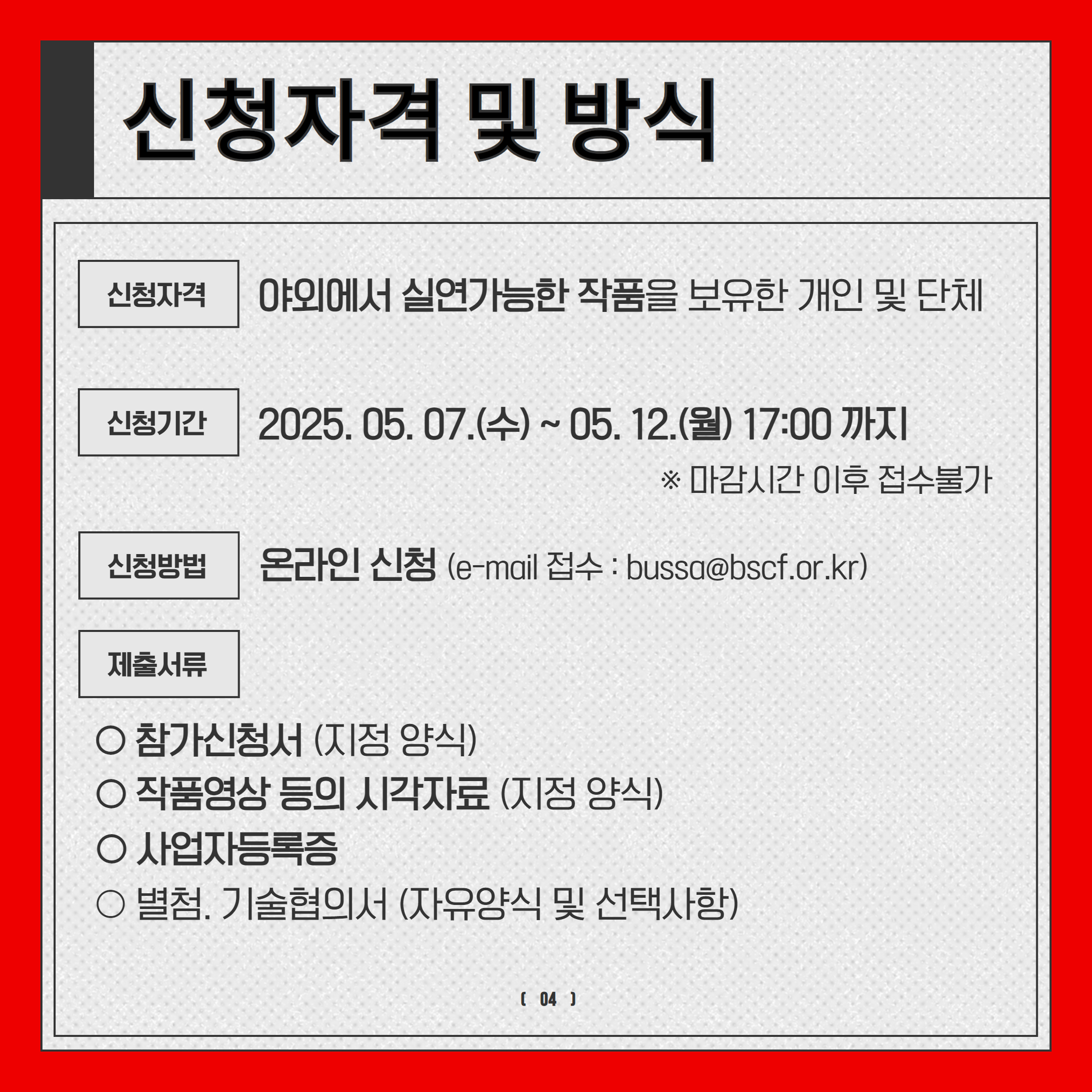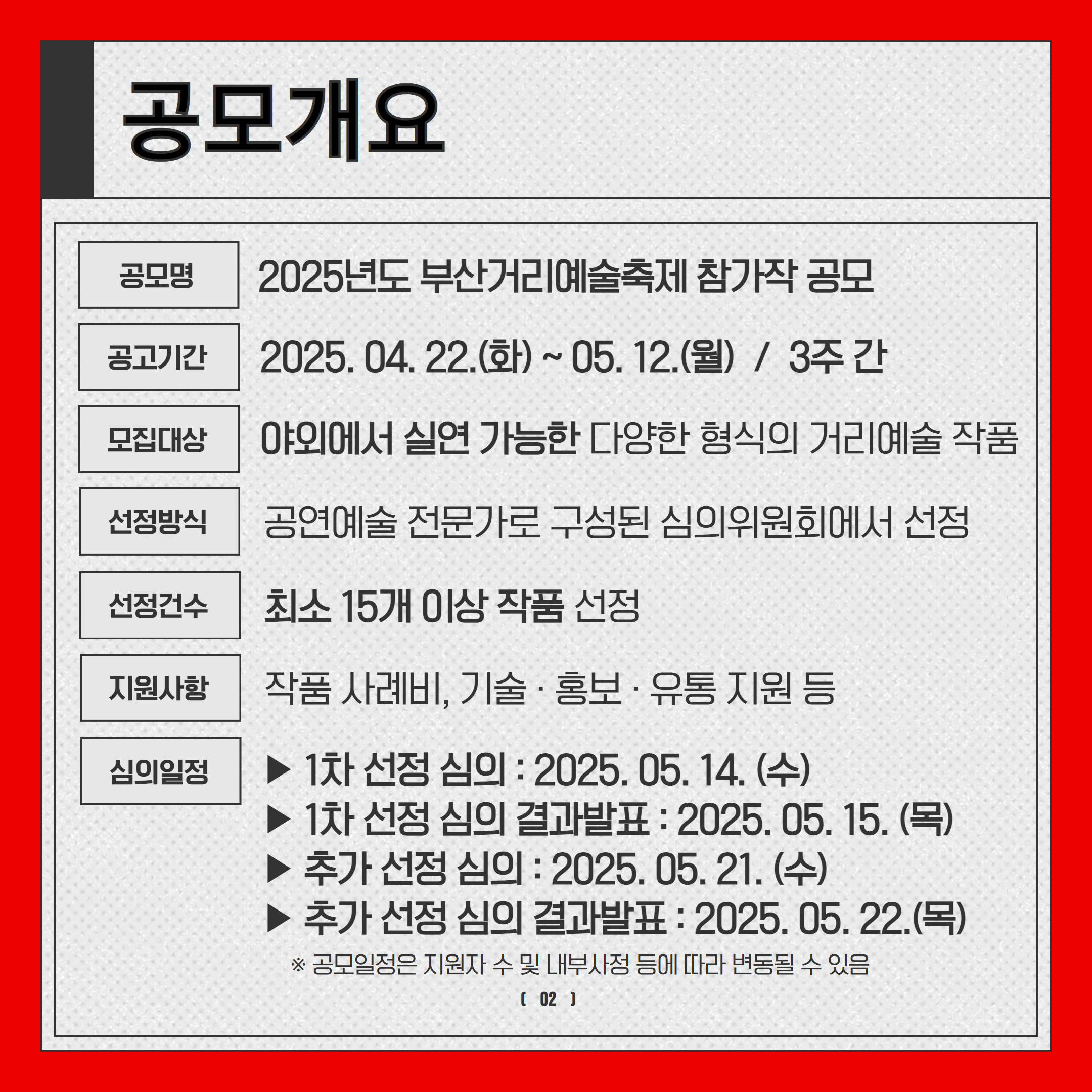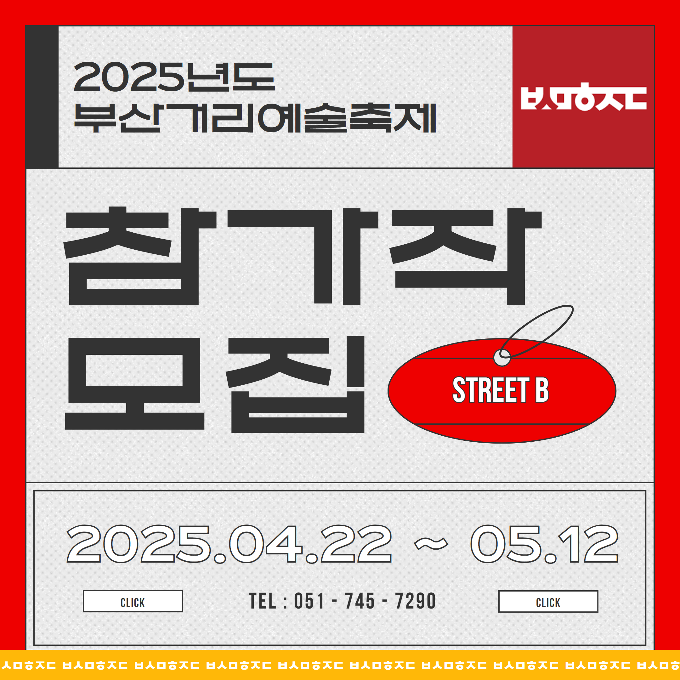 (재)부산문화재단에서는 2025년도 부산거리예술축제 참가작을 다음과 같이 모집하오니 부산의 아름다운 해변과 거리를 새로운 공연작품으로 가득 채울 예술가분들의 많은 관심과 참여 부탁드립니다😍1️⃣행사명 : 2025년도 부산거리예술축제2️⃣공연일시 : 2025. 09. 27.(토) ~ 09. 28.(일) 12:00 ~ 20:00 예정3️⃣공연장소 : 해운대해수욕장 일원 및 부산유라시아플랫폼 야외광장4️⃣공고기간 : 2025. 04. 22.(화) ~ 05. 12.(월) / 3주 간5️⃣신청기간 : 2025. 05. 07.(수) ~ 05. 12.(월) 17:00 도착분에 한함6️⃣지원사항 : 작품사례비, 기술/홍보/유통지원 등📞 문의처: 청년융합예술팀 부산거리예술축제 담당자(051-745-7290)