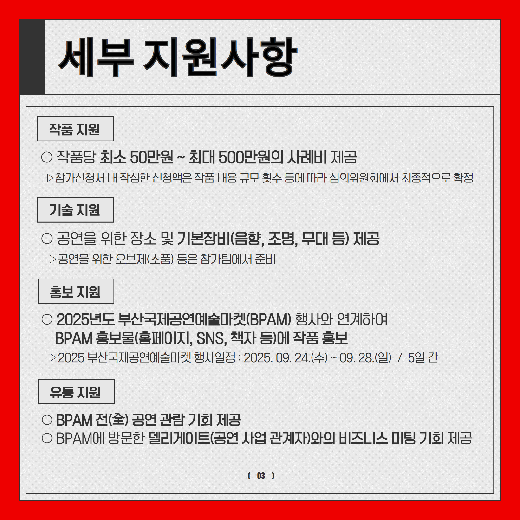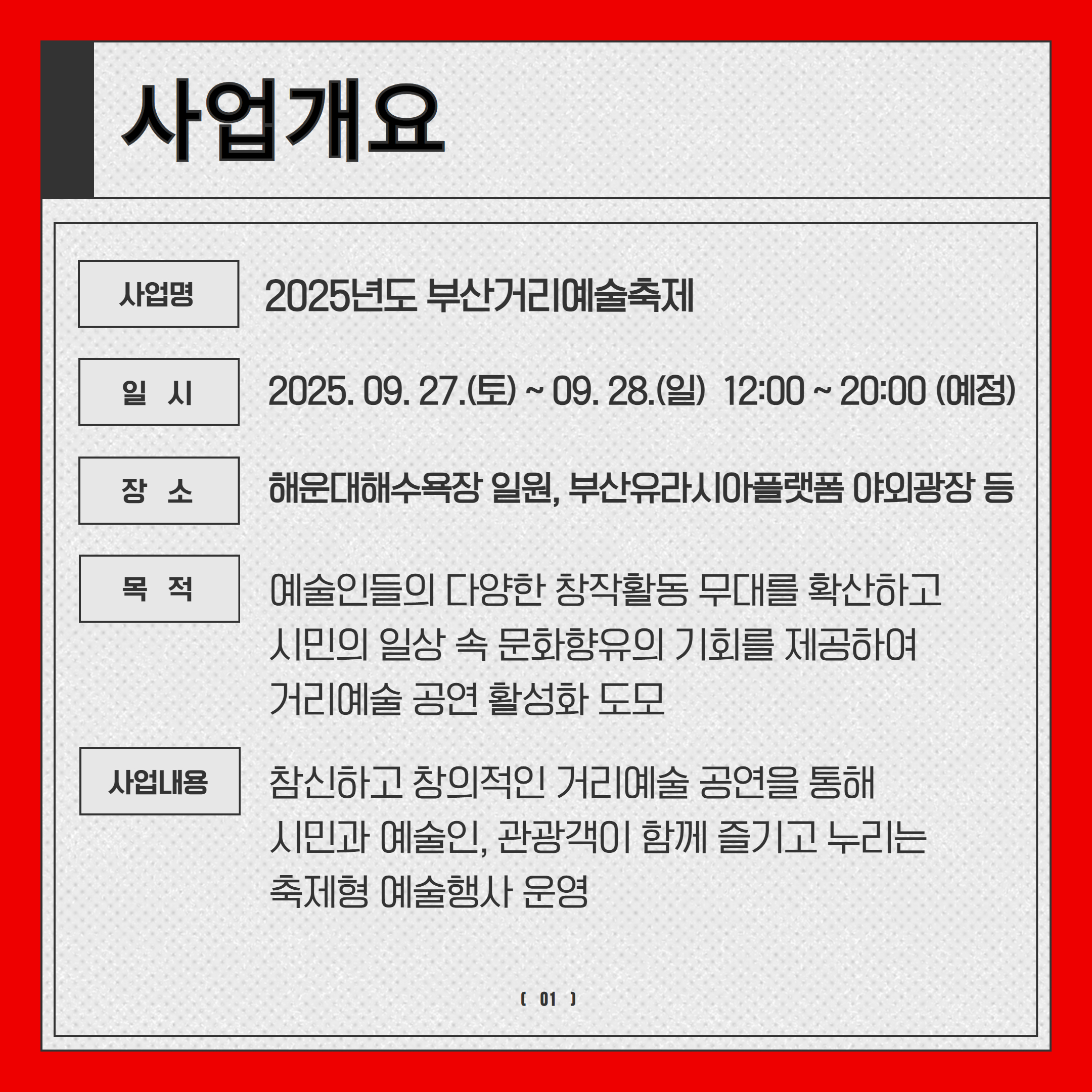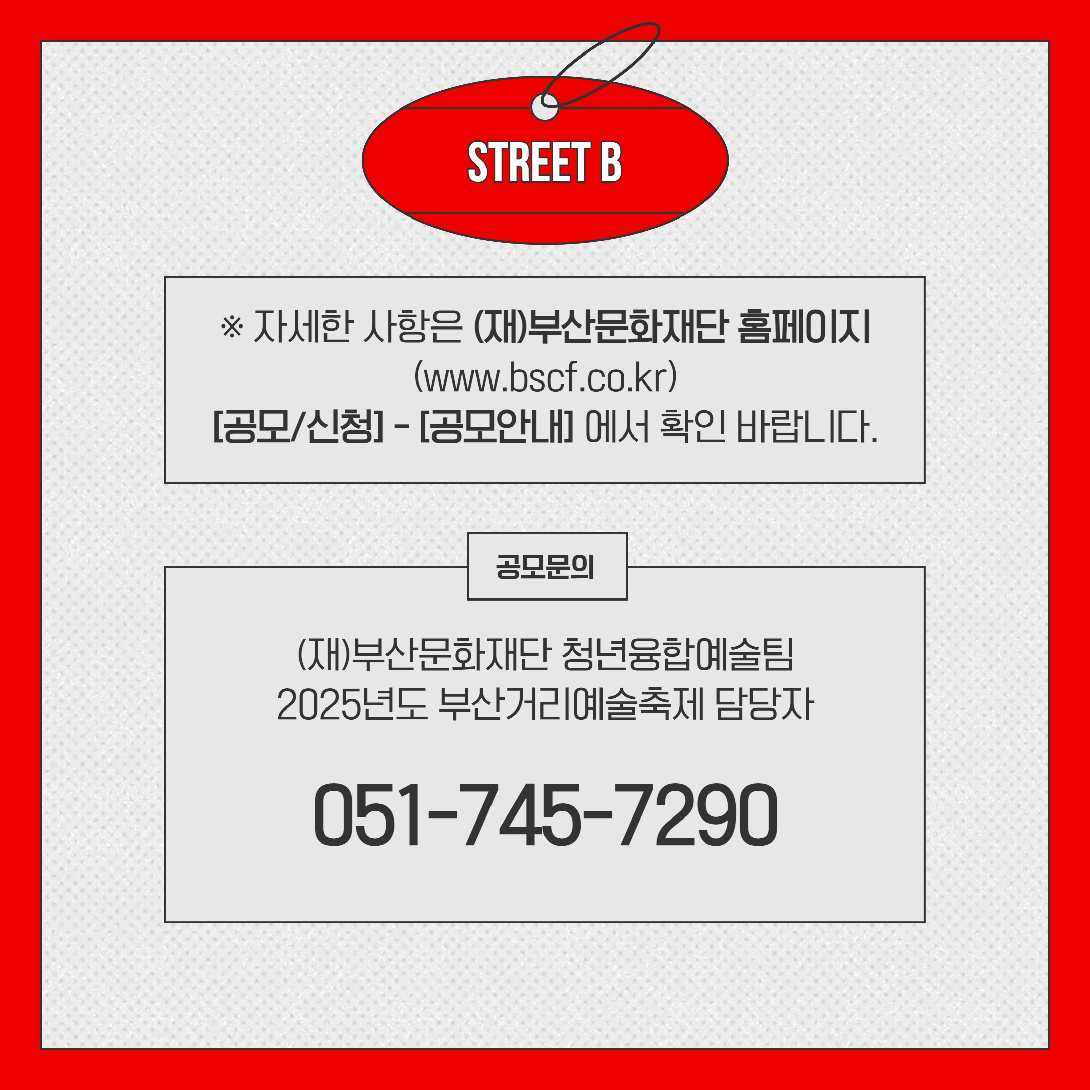 (재)부산문화재단에서는 2025년도 부산거리예술축제 참가작을 다음과 같이 모집하오니 부산의 아름다운 해변과 거리를 새로운 공연작품으로 가득 채울 예술가분들의 많은 관심과 참여 부탁드립니다😍1️⃣행사명 : 2025년도 부산거리예술축제2️⃣공연일시 : 2025. 09. 27.(토) ~ 09. 28.(일) 12:00 ~ 20:00 예정3️⃣공연장소 : 해운대해수욕장 일원 및 부산유라시아플랫폼 야외광장4️⃣공고기간 : 2025. 04. 22.(화) ~ 05. 12.(월) / 3주 간5️⃣신청기간 : 2025. 05. 07.(수) ~ 05. 12.(월) 17:00 도착분에 한함6️⃣지원사항 : 작품사례비, 기술/홍보/유통지원 등📞 문의처: 청년융합예술팀 부산거리예술축제 담당자(051-745-7290)
