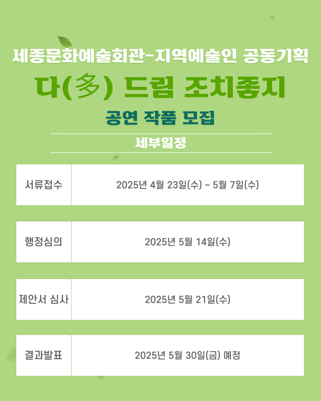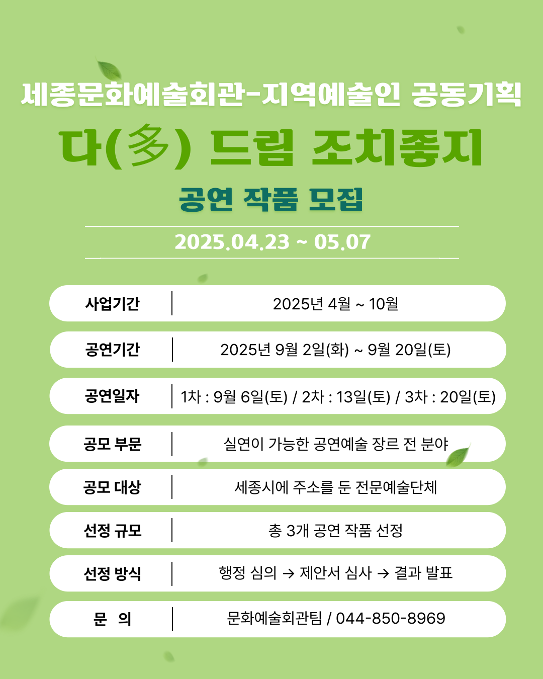 지역 예술 단체들과 협력하여 시민들에게 풍성한 공연예술 향유 기회를 제공하는 세종문화예술회관-지역예술인 공동기획 사업 「다(多)드림 조치좋지」 공연 작품을 모집합니다~! 📍신청기간 : 25.4.23.(수) ~ 5.7.(수) 📍공모대상 : 세종시에 주소를 둔 전문예술단체 📍공모부문 : 실연이 가능한 공연예술 장르 전 분야 📍공연일자 : 25년 9월 6일(토), 13일(토), 20일(토) 📍신청방법 : 세종시문화관광재단 누리집 공고 확인 → 지원서 작성 및 이메일 접수 - 접수메일 : khj9012@sjcf..kr - 문의 : 세종문화예술회관 문예회관팀 044-850-8969자세한 내용은 세종시문화관광재단 및 세종문화예술회관 누리집을 통해 확인 가능합니다☺