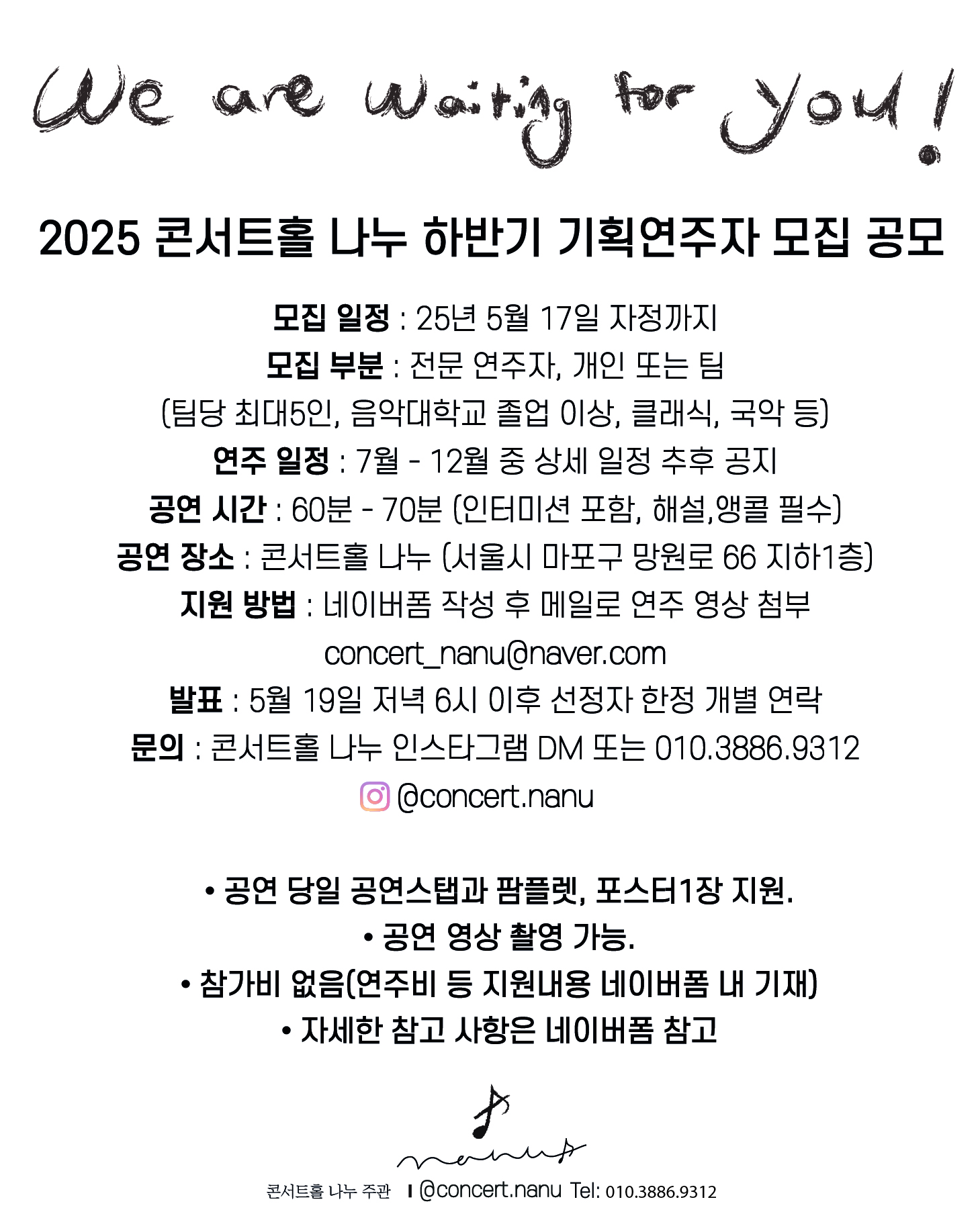 ■ 모집 개요 *모집 마감: 2025년 5월 17일(토) 자정까지 *모집 대상: 개인 또는 팀 (최대 5인), 음악대학 졸업 이상의 전문 연주자 (클래식, 국악 등 장르 무관) *연주 일정: 2025년 7월 ~ 12월 중 (상세 일정 추후 협의) *공연 시간: 60분~70분 (인터미션 포함, 해설 및 앙코르 포함 필수) *공연 장소: 콘서트홀 나누 (서울시 마포구 망원로 66 지하 1층)