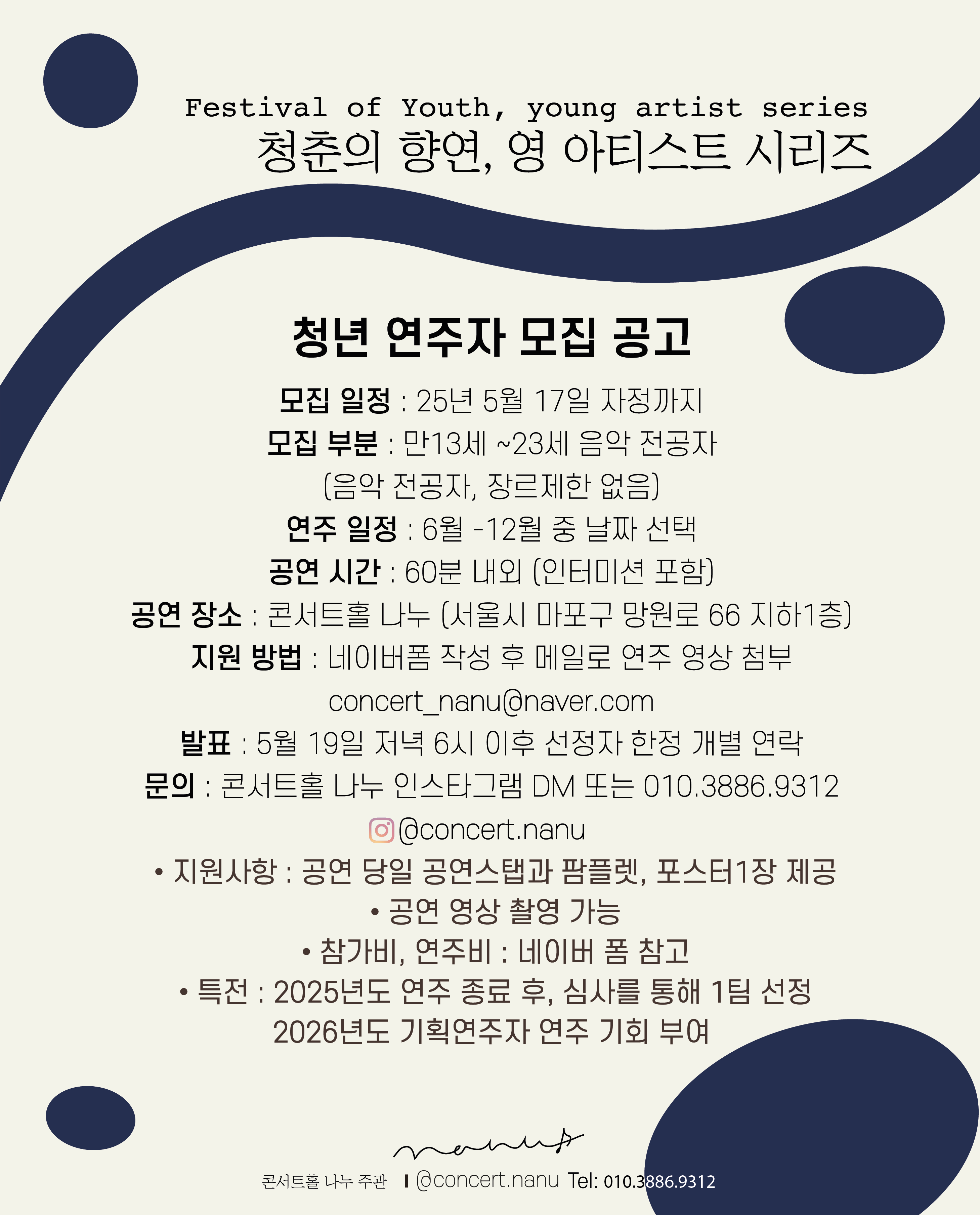망원동 클래식 콘서트홀 ‘콘서트홀 나누’에서 2025년 하반기 청년 음악 전공자를 위한 ‘청춘의 향연, 영 아티스트 시리즈’를 진행합니다. 많은 관심과 지원 바랍니다.