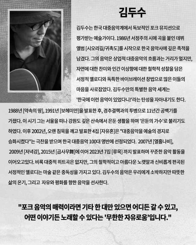 한국 포크의 살아있는 전설,김두수 선생님의 깊이 있는 음악 여정을여러분과 함께 나누고자 합니다.