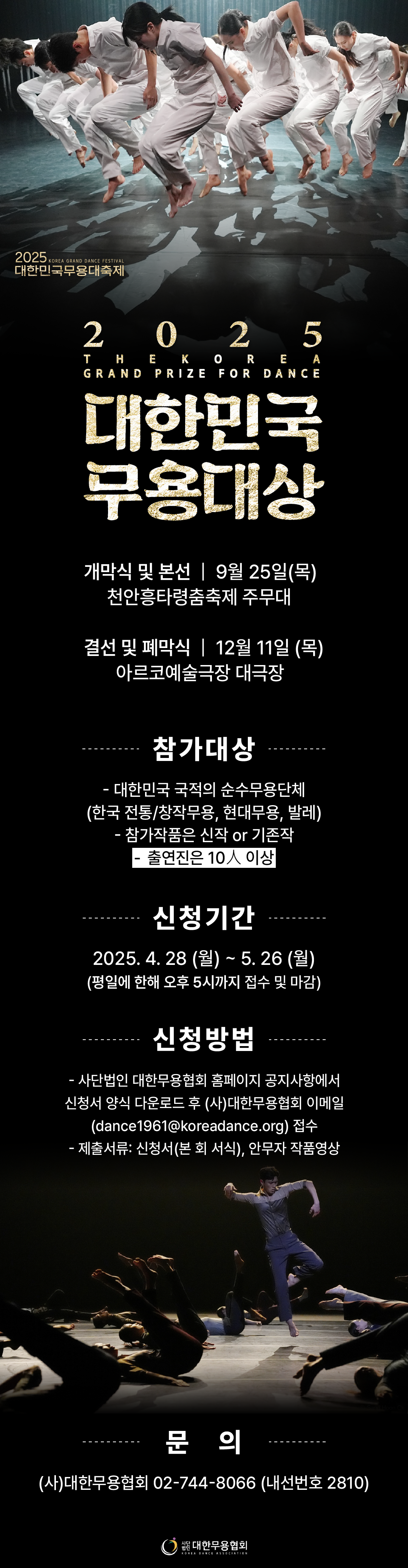 참가대상 대한민국 국적의 순수무용단체 (한국 전통/창작무용, 현대무용, 발레) 신청기간 2025년 4월 28일 (월) ~ 5월 26일 (월) (평일에 한해 오후 5시까지 접수 및 마감) 신청방법 https://keadanceassociation.g/notice/read/492?p=1 사단법인 대한무용협회 홈페이지 공지사항에서 신청서 양식 다운로드 후 (사)대한무용협회 이메일접수 문의 (사)대한무용협회 02-744-8066 (내선번호 2810) 많은 관심과 참여 부탁드립니다