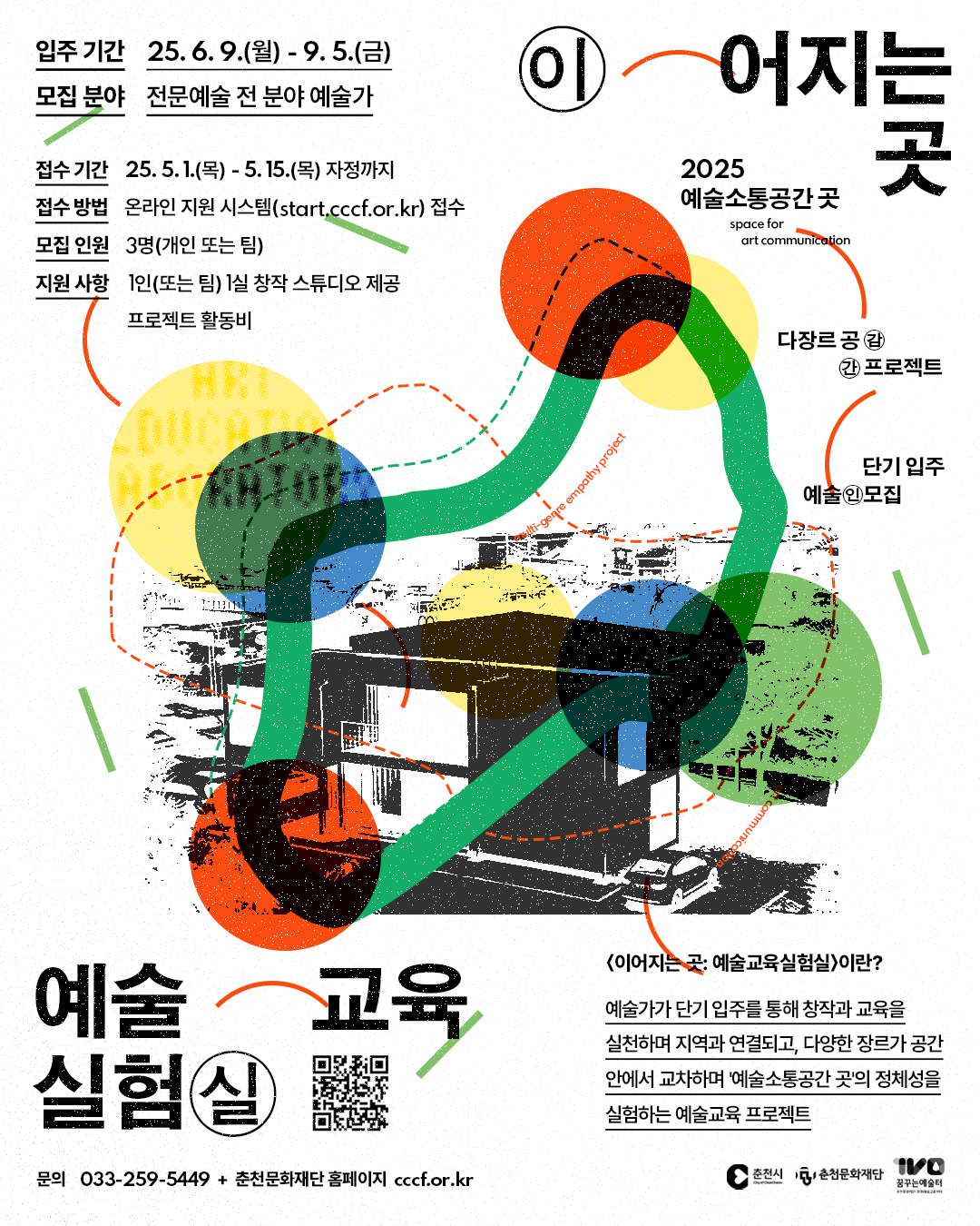 ✨예술소통공간 곳에서 다장르 예술인을 대상으로 '단기 입주자' 를 모집합니다! ✨ 다장르 공감(간) 프로젝트 『이어지는 곳: 예술교육실험실』은 춘천의 예술인들이 지역성과 동시대성을 주제로 프로젝트를 제안하고, '예술소통공간 곳’에 입주하여 창작과 예술교육 활동을 함께 실현하는 예술 소통형 단기 입주 프로그램입니다. 다양한 장르의 예술가들이 직접 기획한 프로젝트를 통해 지역에 스며든 이야기와 공간, 사람을 감각적으로 탐색하고 예술교육을 통해 시민과 예술의 접점을 만들어갑니다. 🧭 지역과 예술을 연결하는 실험, '예술소통공간 곳’에서 함께할 다장르의 예술인 여러분들의 많은 관심과 참여 바랍니다. 📌 입주 기간: 2025. 6. 9. ~ 9. 5. (약 3개월) 🏠 입주 장소: 예술소통공간 곳(춘천로 112, 몸짓극장 옆) 창작스튜디오 📩 접수 마감: 2025. 5. 15.(목) 23:59 🔗 접수 방법: 온라인 지원사업 시스템(https://start.cccf..kr) 🎯 모집 대상: 다장르 전문 예술인 📞 문의: 춘천문화재단 문화예술교육센터 033-259-5449