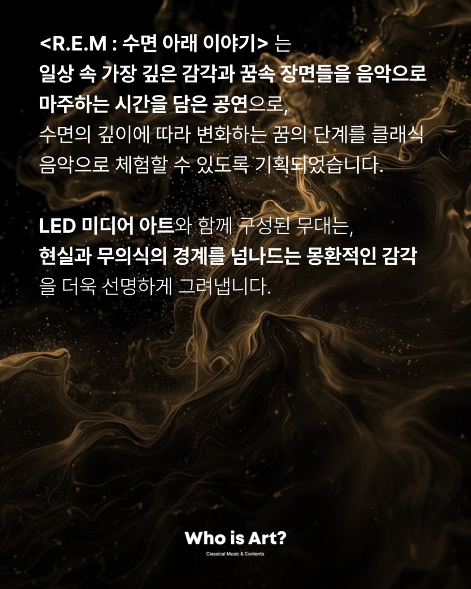 <R.E.M> 수면 아래 이야기 는 클래식 음악을 통해 꿈의 단계별 변화를 체험할 수 있도록 기획된 공연입니다.