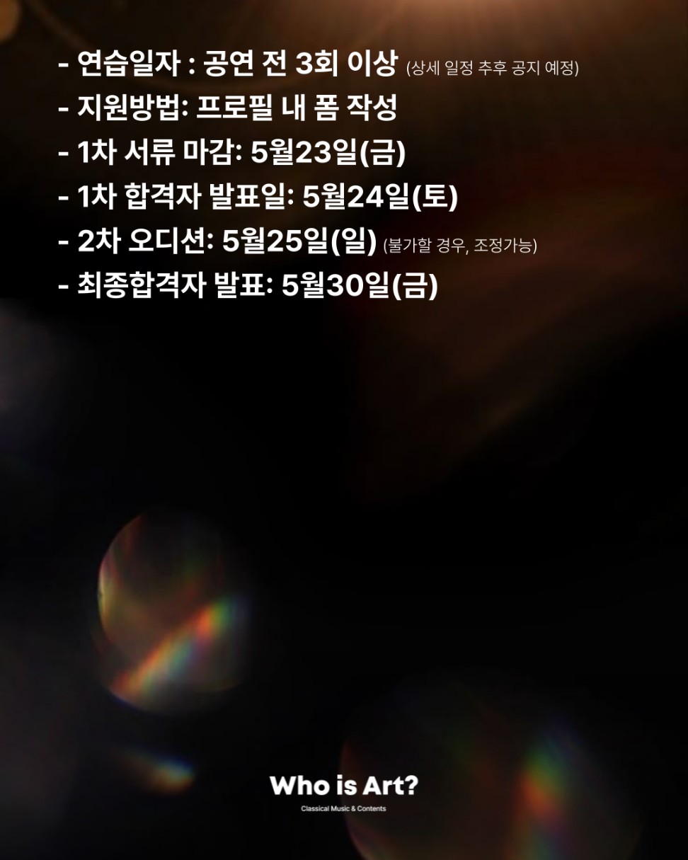📆선발 일정 - 1차 서류 접수 : 5월 12일-5월23일 - 2차 오디션 : 5월 25일 *자유곡 **합격자 개별 문자 통하여 일정 및 장소 안내 예정 - 최종합격자 발표일 : 5월 30일 - 연습일자 : 공연 전 3회 이상 진행 및 당일 리허설