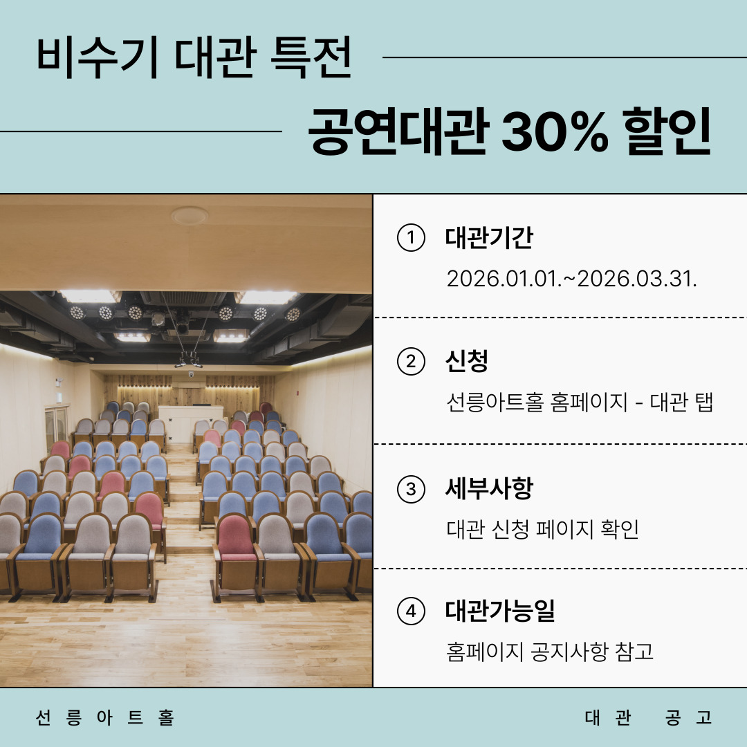대관기간: 2026.01.01~ 2026.03.31 신청방법: 선릉아트홀 홈페이지 - 대관 탭 세부사항: 대관 신청 페이지 확인 대관가능일: 홈페이지 공지사항 '2026 비수기 공연대관료 할인' 확인 홈페이지: http://k-arthall.com/sa/