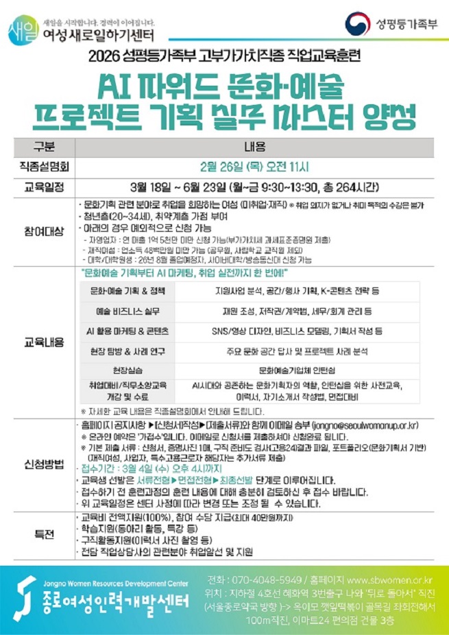 안녕하세요! 여러분의 커리어 메이트, 종로여성인력개발센터입니다.