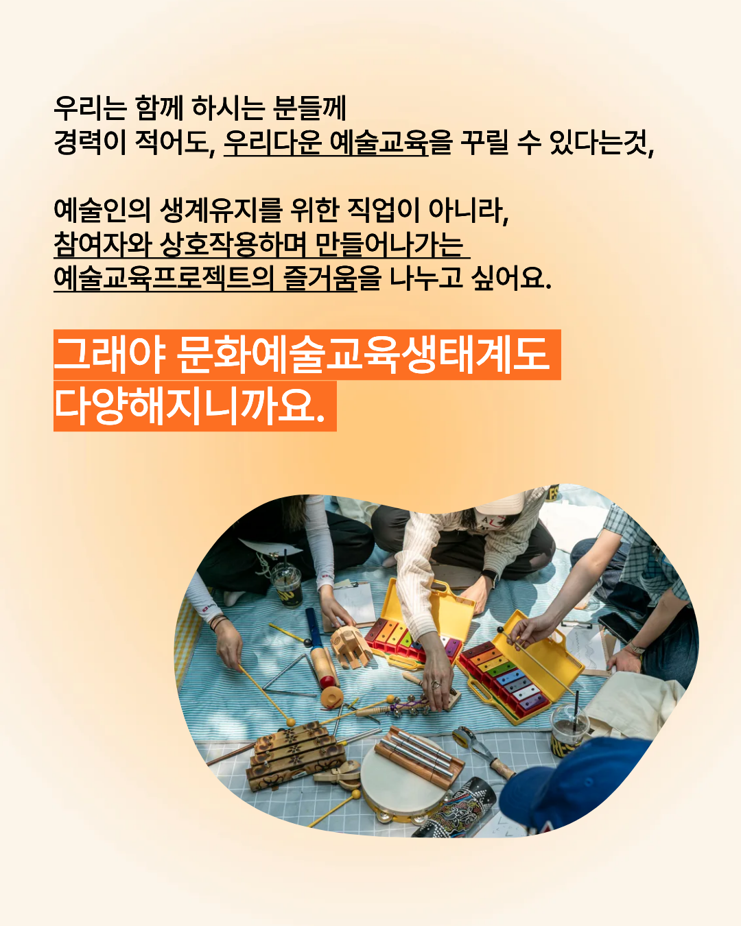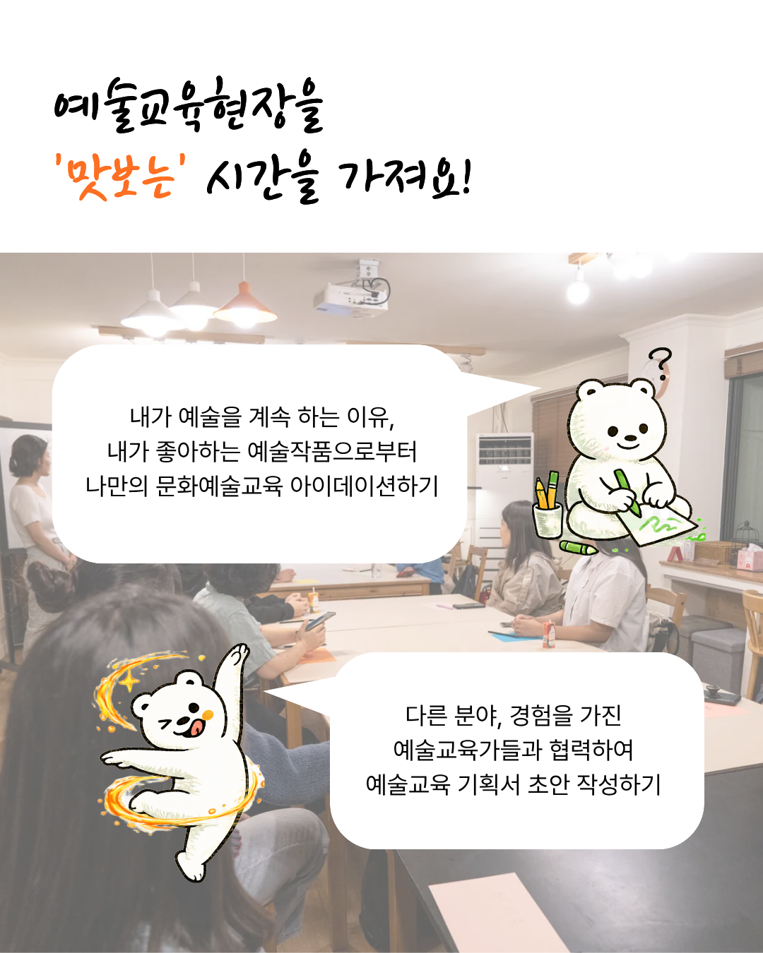 ❓예술교육, 어떻게 시작해야 할까요? ❓다른 장르의 예술교육가들은 어디서 만나고, 어떻게 협업할까요? ❓기획서는 도대체 어떻게 써야 할까요?