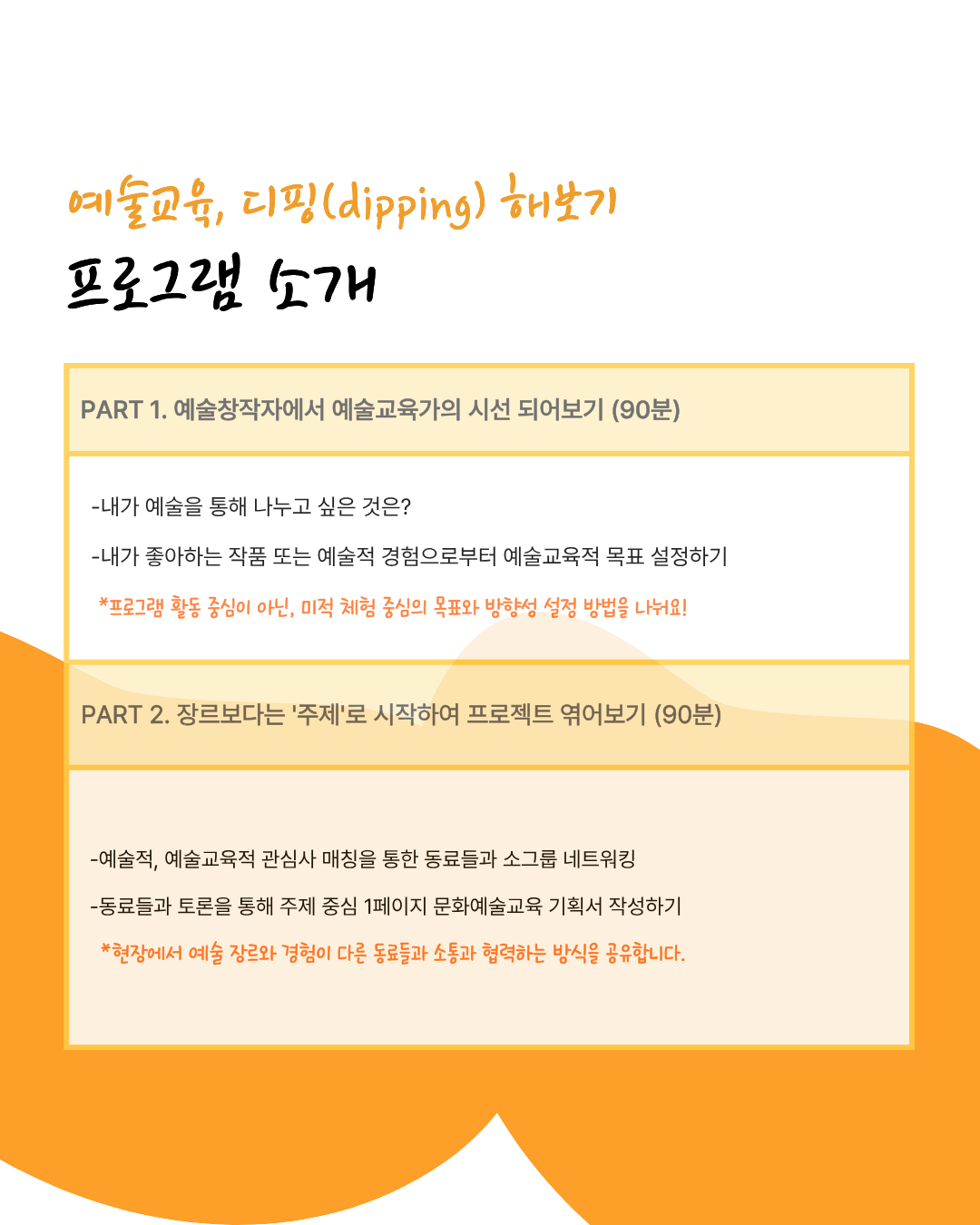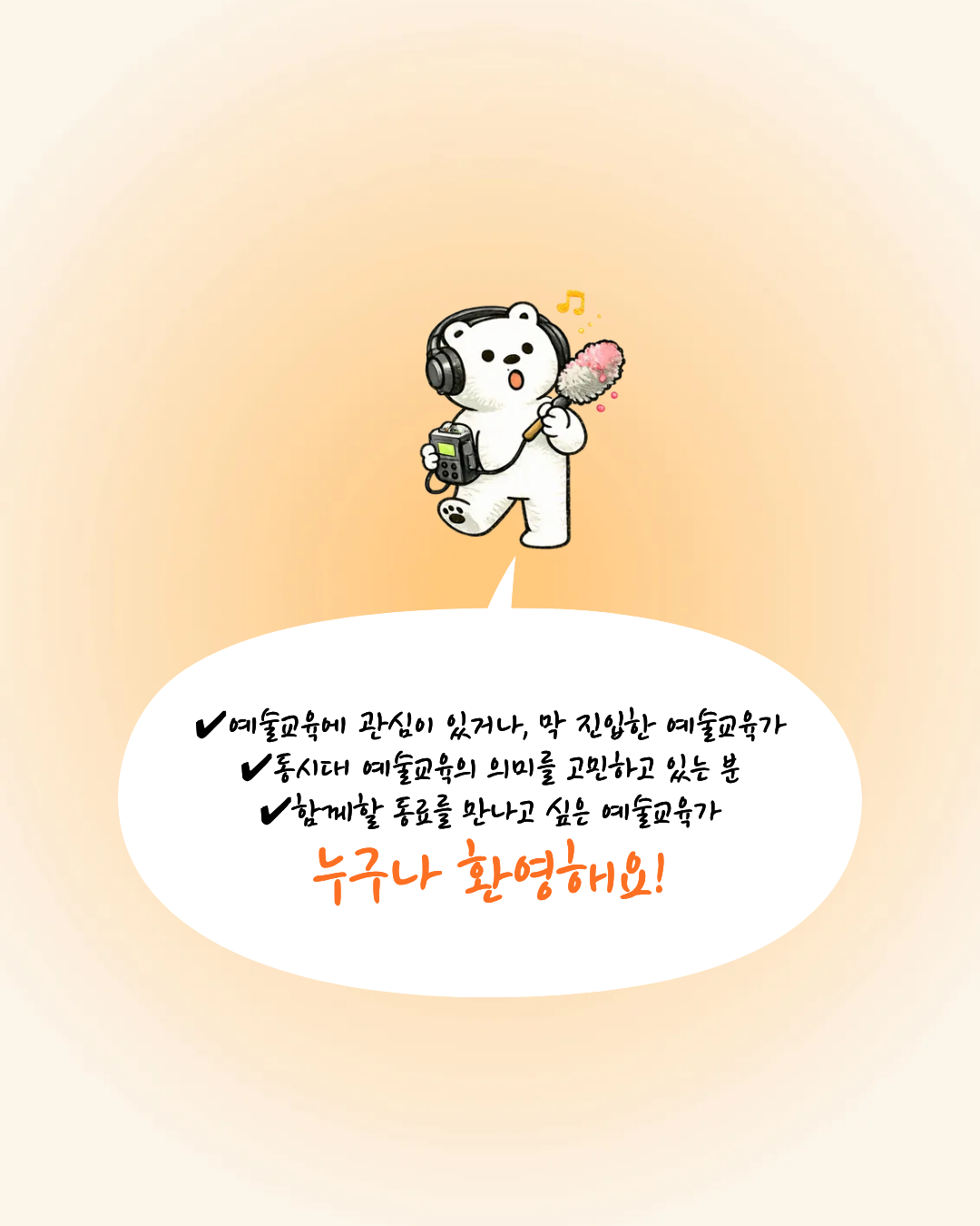 📍대상 ✔️예술교육에 관심이 있거나, 막 진입한 예술교육가 ✔️동시대 예술교육의 의미를 고민하고 있는 분 ✔️함께할 동료를 만나고 싶은 예술교육가