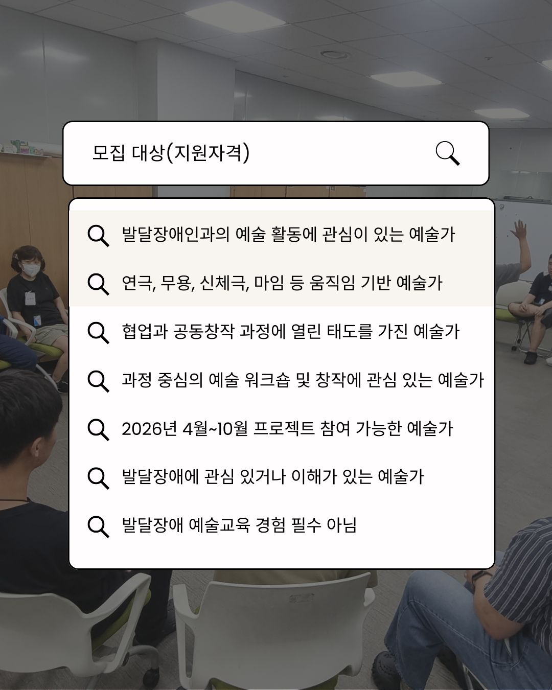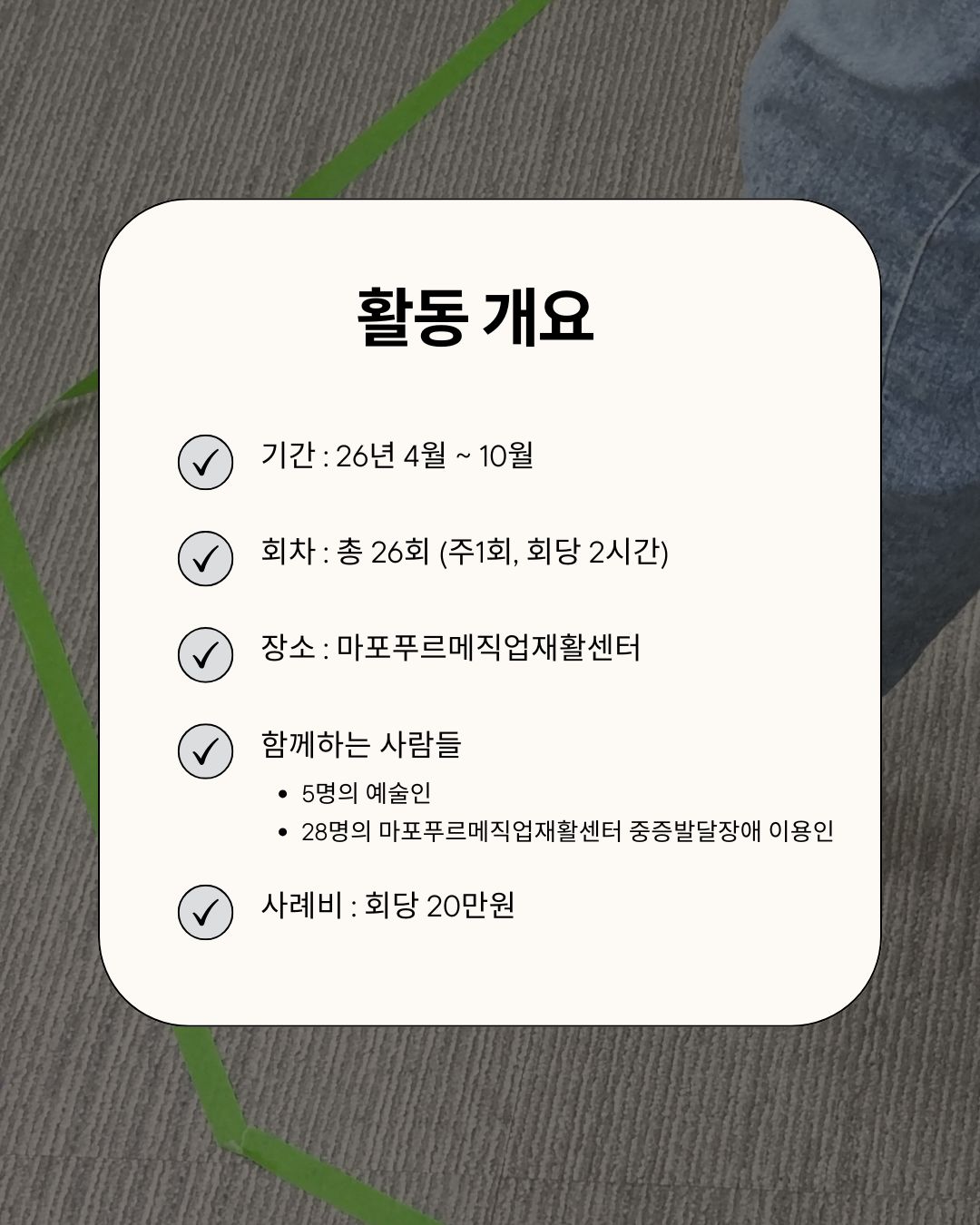 2026년, 마포푸르메직업재활센터 28인의 발달장애 이용인과 함께 공연을 공동으로 만들어 갈 예술가를 모집합니다.