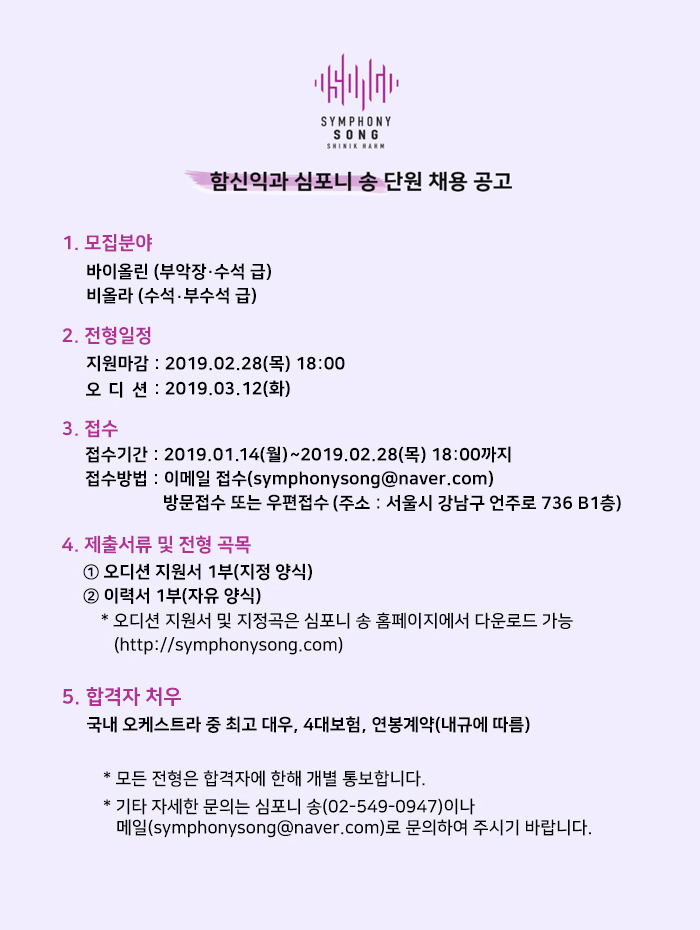 2019년도 우수 연주자를 다음과 같이 초청, 모집하오니 역량있는 분들의 많은 관심과 응시 바랍니다.