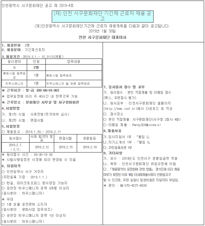 인천서구문화재단에서 기간제 근로자를 채용합니다.