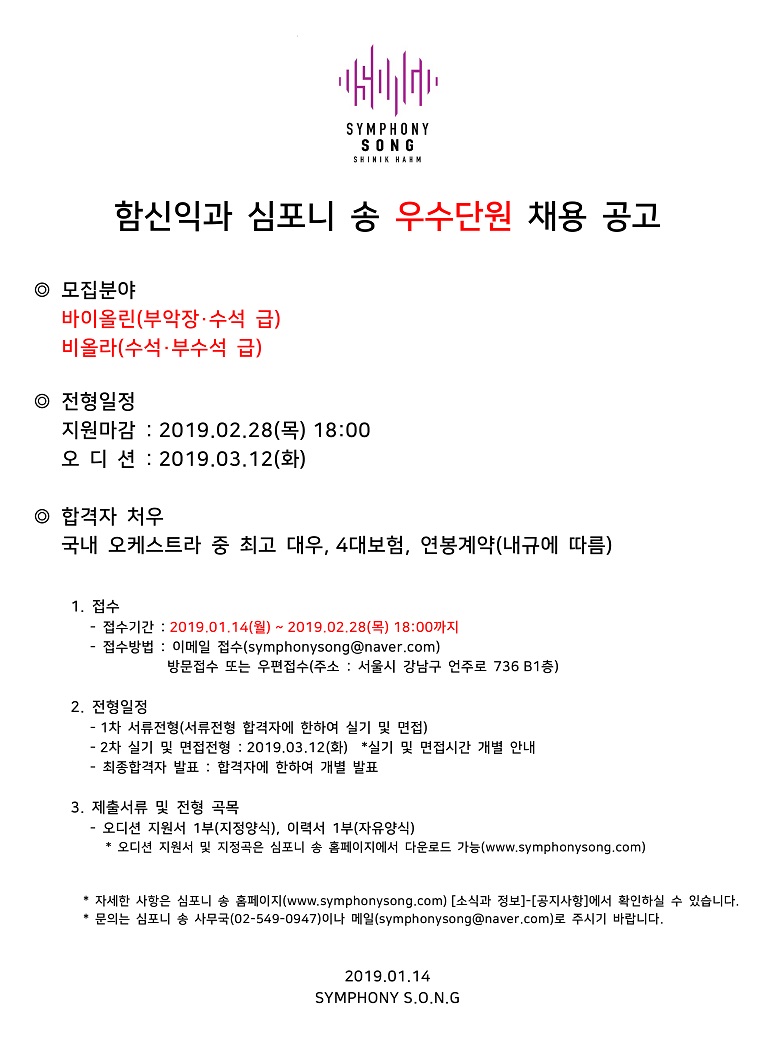 2019년도 우수 연주자를 다음과 같이 초청, 모집하오니 역량있는 분들의 많은 관심과 응시 바랍니다.