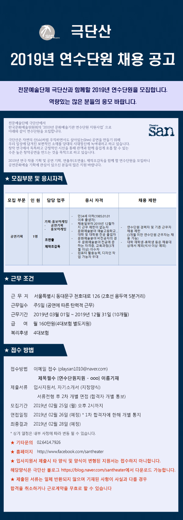 2. 지원방법: 이메일접수(playsan1010@naver.com) - 제출서류 : 이력서, 자기소개서 (https://blog.naver.com/santheater/221463280356에서 다운로드)