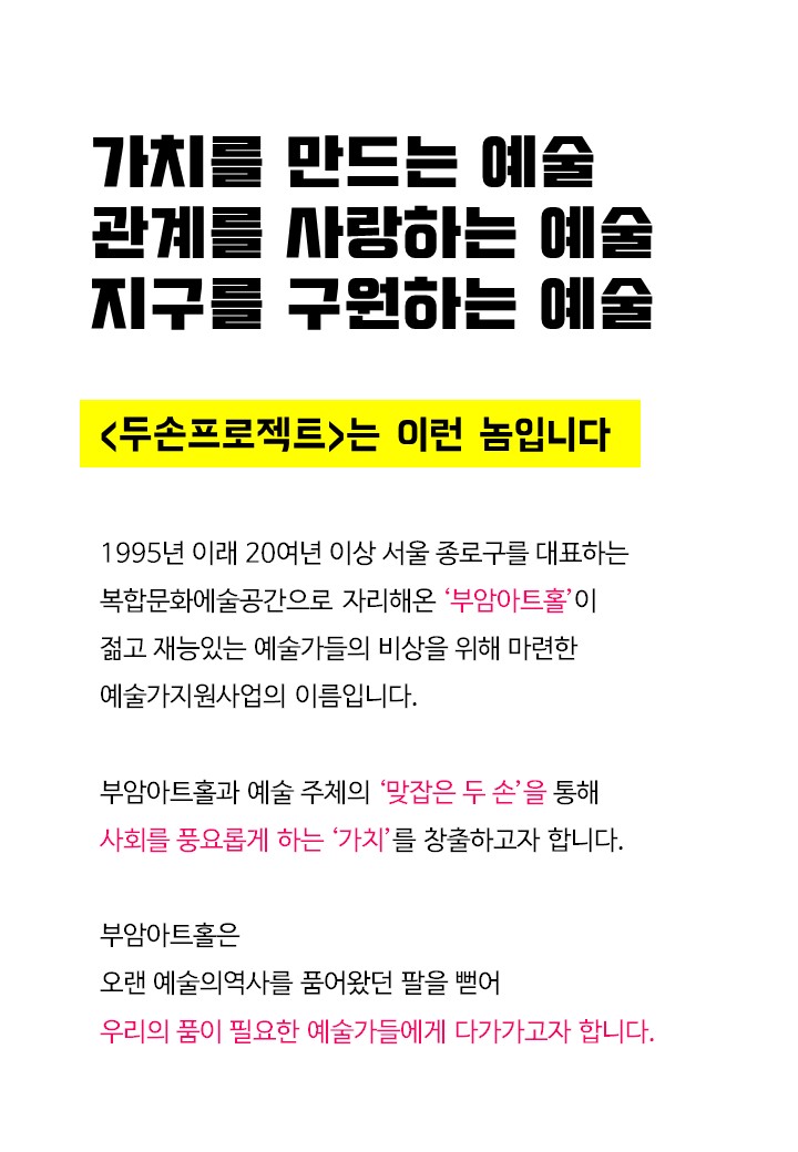부암아트홀의 <두손프로젝트>는, 예술가와 부암아트홀이 ‘손과 손을 맞잡다’는 뜻을 바탕으로 탄생했다. 부암아트홀과 청년예술가 이 두 주체의 관계를 상하 관계 혹은 갑을 관계로 규정하지 않고 수평적인 협력 관계를 통해 지역 사회 문화 거점 활성화 및 예술 산업 발전에 이바지한다는 것이 이 프로젝트의 주된 목표이다.