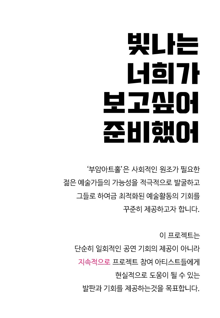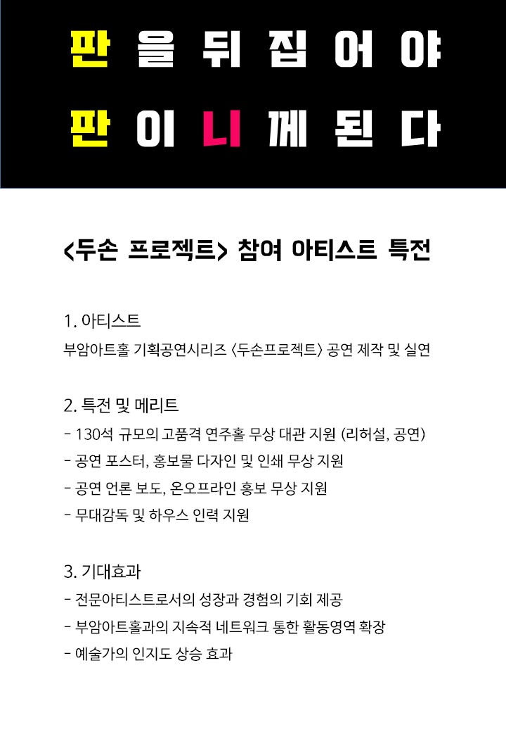 1. 프로젝트 내용 부암아트홀 기획공연시리즈 <두손프로젝트> 공연 제작 및 실연 2. 특전 및 메리트 - 130석 규모 부암아트홀 메인홀 무상 대관 지원 - 공연 포스터, 홍보물 디자인 및 인쇄 무상 지원 - 공연 언론 보도, 온오프라인 홍보 무상 지원 - 무대감독 및 하우스 인력 지원 (각 1인) 3. 기대효과 - 전문 아티스트로서 성장과 경험 기회 신장 - 부암아트홀과의 지속적 네트워크 통한 활동 영역 확장 - 인지도 상승 및 예술가 본인의 역량 증명