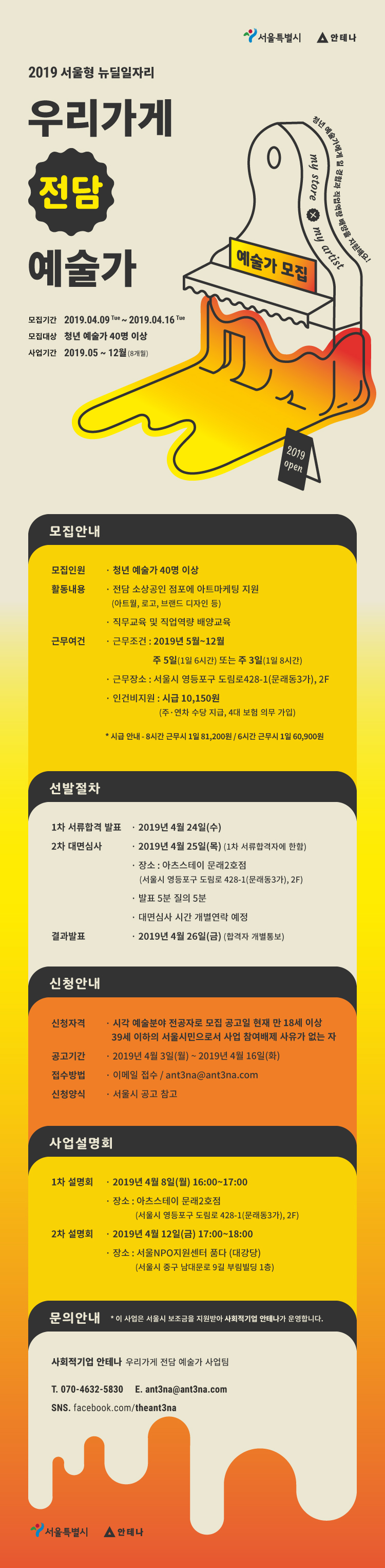 「2019년 서울형 뉴딜일자리 우리가게 전담예술가 사업」을 이끌어갈 청년 예술가를 모집합니다!