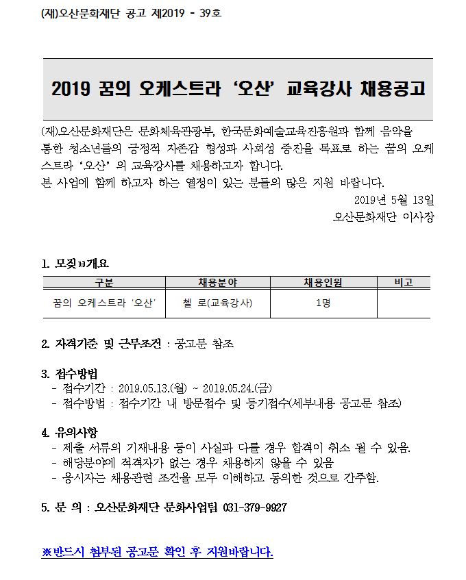 자세한 내용은 오산문화재단 홈페이지 공지사항을 확인 해주세요.