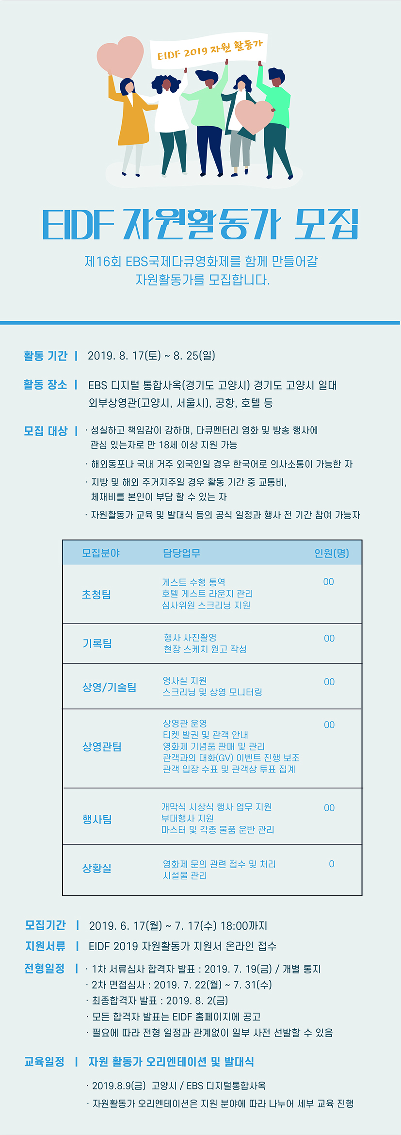 제16회 EBS국제다큐영화제(EIDF2019)에서 자원활동가를 모집합니다.