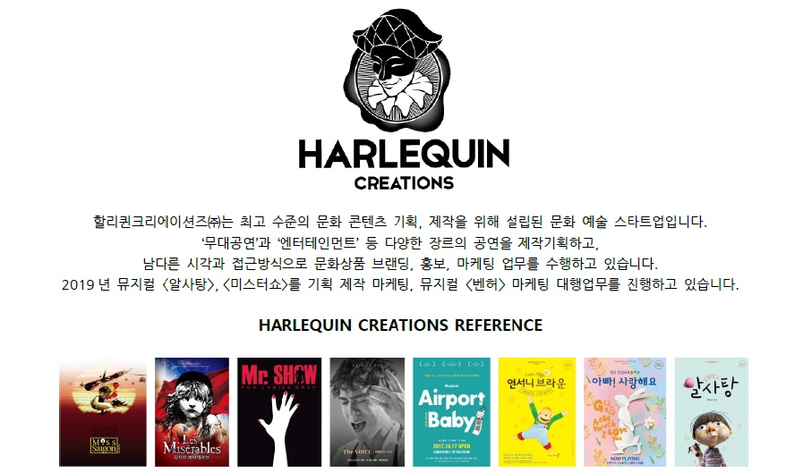 ❖ 채용분야 및 인원 1) 채용분야: 무대스탭 2) 모집인원: 1명 3) 담당업무: 무대크루(공연진행 및 소품관리) 4) 진행공연: 뮤지컬 <알사탕> ❖ 근무요건 1) 근무기간: 2019년 8월 중순 ~ 2020년 3월1일 (기간 조율 가능) 2) 근무장소: 신한카드 판스퀘어 드림홀(합정역) 3) 공연시간: 화~금 11시, 14시, 토~일 11시, 14시, 16시 (월 공연 없음/공연시간은 변동 될 수 있음) 4) 급 여: 면접시 협의 5) 자격조건: 성별 무관, 경력 무관 (휴학생 및 장기근무자 우대) ❖ 제출서류 및 기한 1) 서류접수일정: 2019년 7월 28일(일) 23:59까지 이메일 접수 2) 제출서류: 이력서(자율형식) 3) 접수방법: 이메일 접수 4) 전형일정: 서류 접수 후 면접 대상자 개별 통보 (서류 접수기간 수시면접 진행) ❖ 문의 할리퀸크리에이션즈㈜ 채용 담당 admin@hqcreations.co.kr