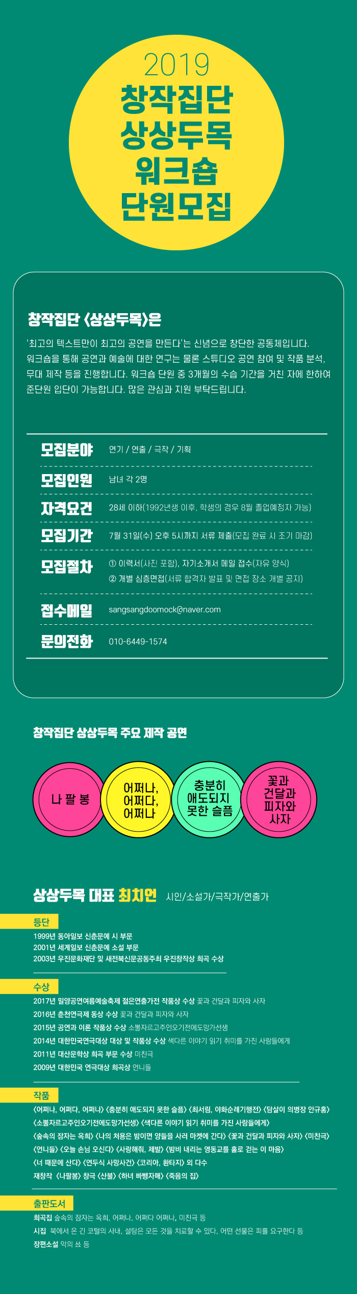 '창작집단 상상두목'에서 2019 워크숍 단원을 모집합니다.