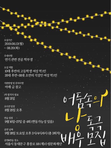 - 모집 기간 : 8월 12일(월) ~ 8월 20일 (화) - 우대 사항 : 연기 관련 전공 학부생 - 공연 장르 : 낭독극 - 공연 시간 : 40분 - 모집 역할 : 10대 후반의 고등학생 여성 역 1인 20대 후반~30대 초반의 직장인 여성 역 1인