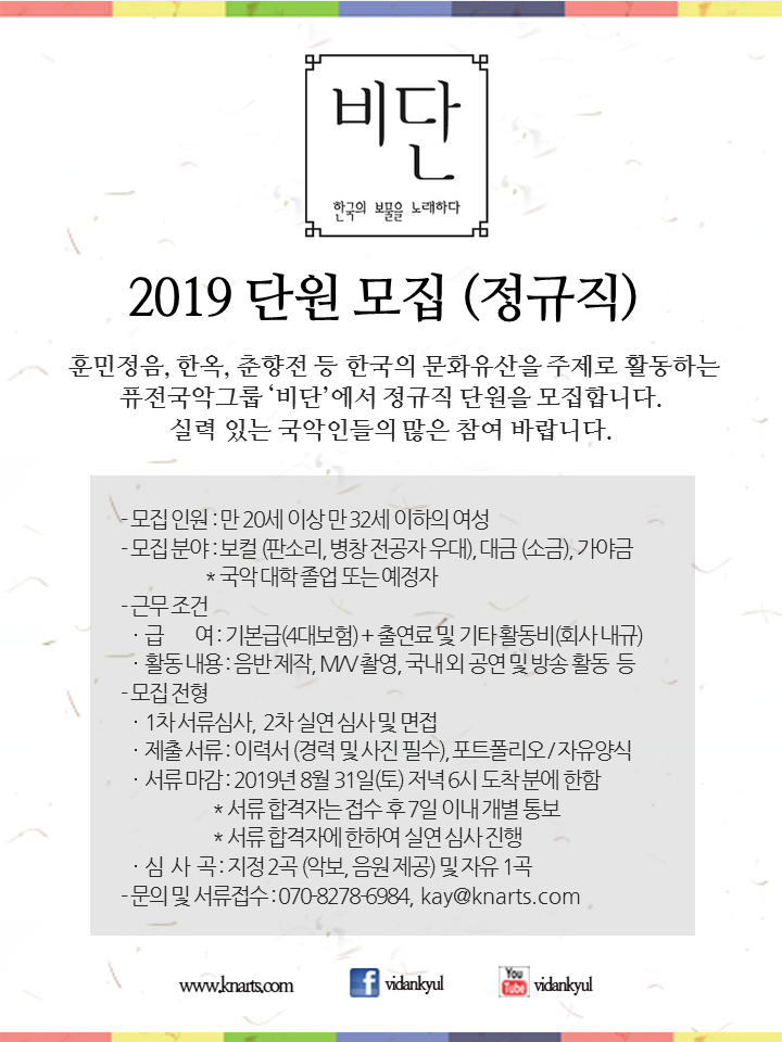 퓨전국악 비단 정규직(보컬,대금,판소리)모집 -8월 31일