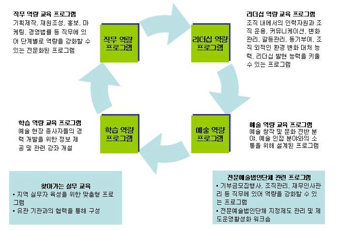 ○ 문화예술 기획경영 종사자의 핵심 역량을 중심으로 전문성을 강화하고 경력을 개발할 수 있는 지식, 정보, 노하우 제공