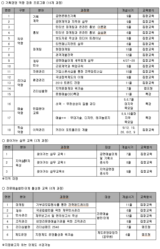 ○ 집합교육: 서울문화재단 대학로연습실 세미나실 (전화: 02-747-7805)