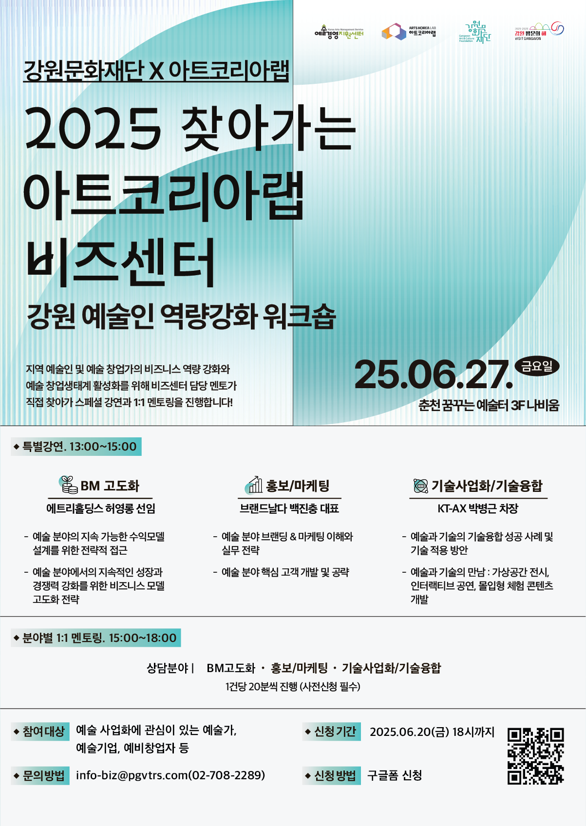 - 대상 : 강원 지역 내 예술인, 예술단체 대표자 및 실무자, 예비창업가 등