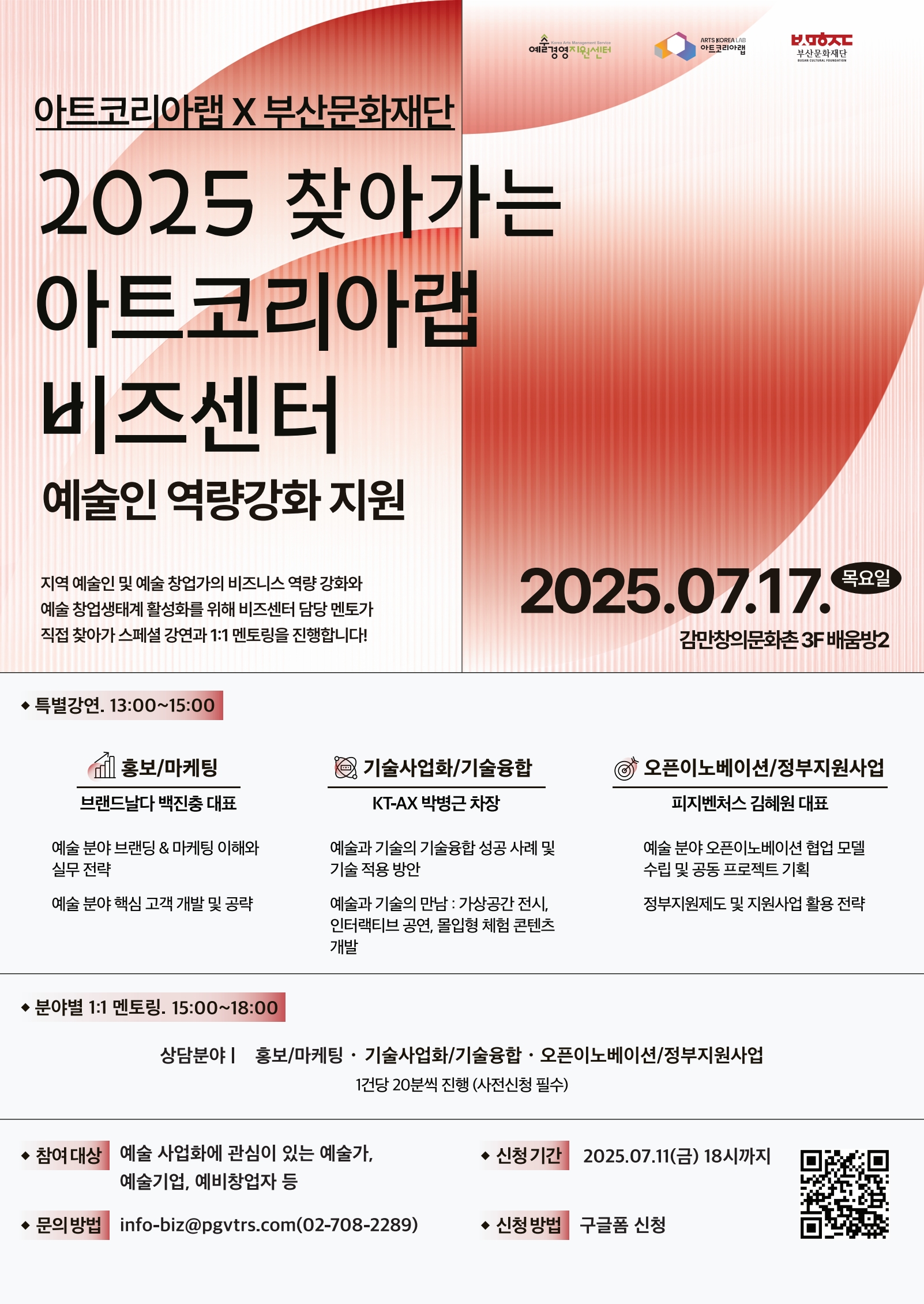 - 대상 : 부산 지역 내 예술인, 예술단체 대표자 및 실무자, 예비창업가 등