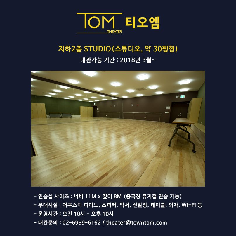 대학로TOM(티오엠) 연습실 대관 공고입니다.