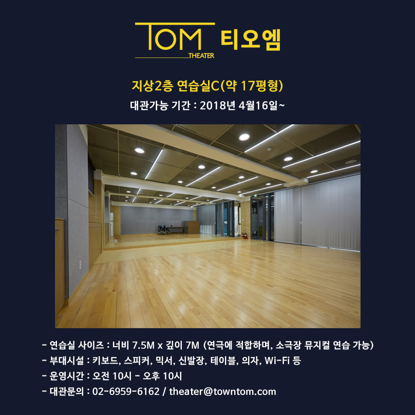 티오엠씨어터는 중·소극장 뮤지컬 및 연극 연습에 적합한 30평형의 지하 연습실과 연극 및 소규모 뮤지컬 연습에 적합한 17평형의 지상 연습실을 운영하고 있습니다.