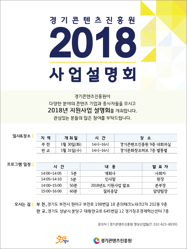경기콘텐츠진흥원에서 2018년 사업설명회를 개최합니다.
