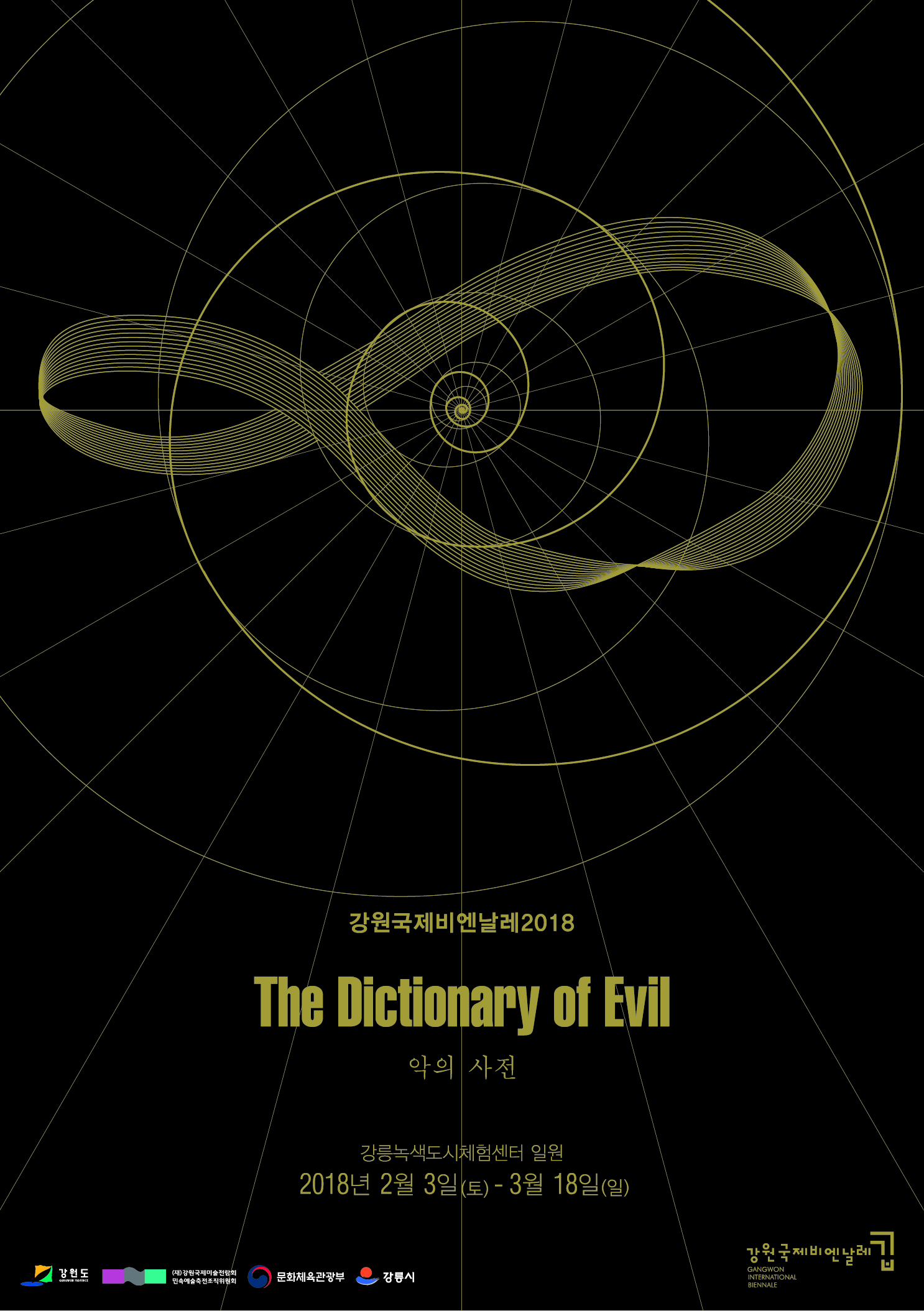 ‘강원국제비엔날레 2018’의 주제인 ‘악의 사전(The Dictionary of Evil)’은 ‘선의 결핍’이라는 종교적 윤리학의 관점이 아닌, 인간의 도덕적 의식에 반하는 우리 사회 속 (간혹)특수하거나 보편적 악을 끝없는 현재로 추념(追念)하려는 예술가들의 노력을 보여준다. 이 노력은 예술언어를 통해 사회 내 예술의 본질과 역할에 대해 질문해온 예술가들의 책무와 비엔날레의 기본적인 역할을 바탕으로 한다. 양심과 방심이 교차하는 당대의 문제들 앞에서 인류가 함께 해야 할 ‘예술적 필요’를 전략적으로 보여줌과 더불어 오늘날의 미술이 언급해야 할 이슈는 무엇이고 담론은 무엇이어야 하는지를 가장 현실적인 관점에서 논의하는 자리다.