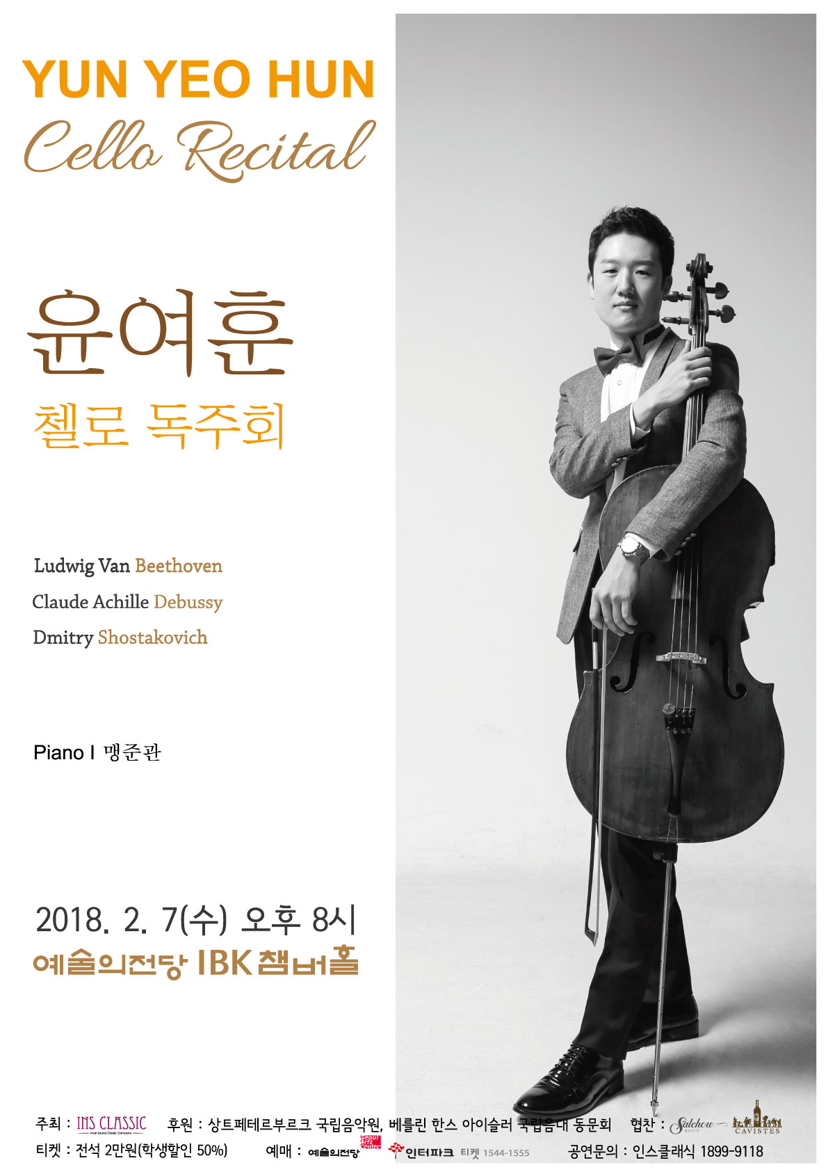 베토벤, 드뷔시, 쇼스타코비치의 곡들로 구성하여 고전과 현대 시대의 작곡가들이 표현한 다양한 첼로의 음색을 감상할 수 있는 윤여훈 첼로 독주회, 2월 7일 수요일 오후 8시에 예술의전당 IBK챔버홀에서 열립니다. 많은 관심과 사랑 부탁드립니다.