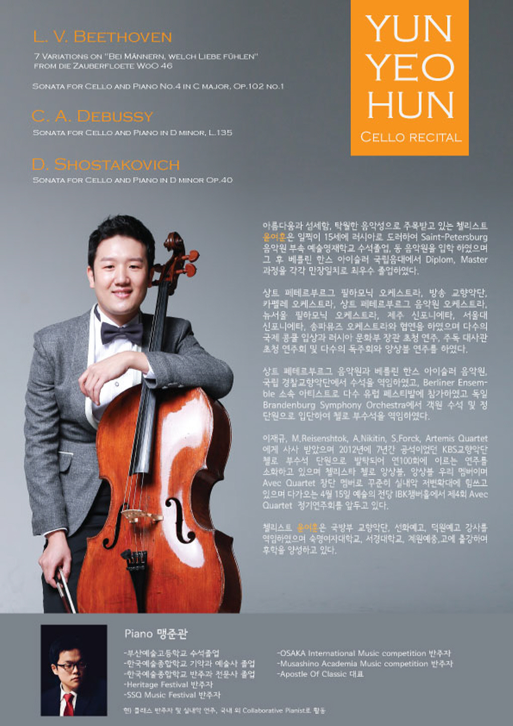 [ 프로그램 ] L.V.Beethoven – 7 Variations on "Bei Männern, welche Liebe fühlen“ L.V.Beethoven – Cello Sonata No.4 in C Major, Op.102 No.1 C.A.Debussy – Sonata for Cello and Piano in D minor, L.135 INTERMISSION D.Shostakovich – Cello Sonata in D minor, Op.40