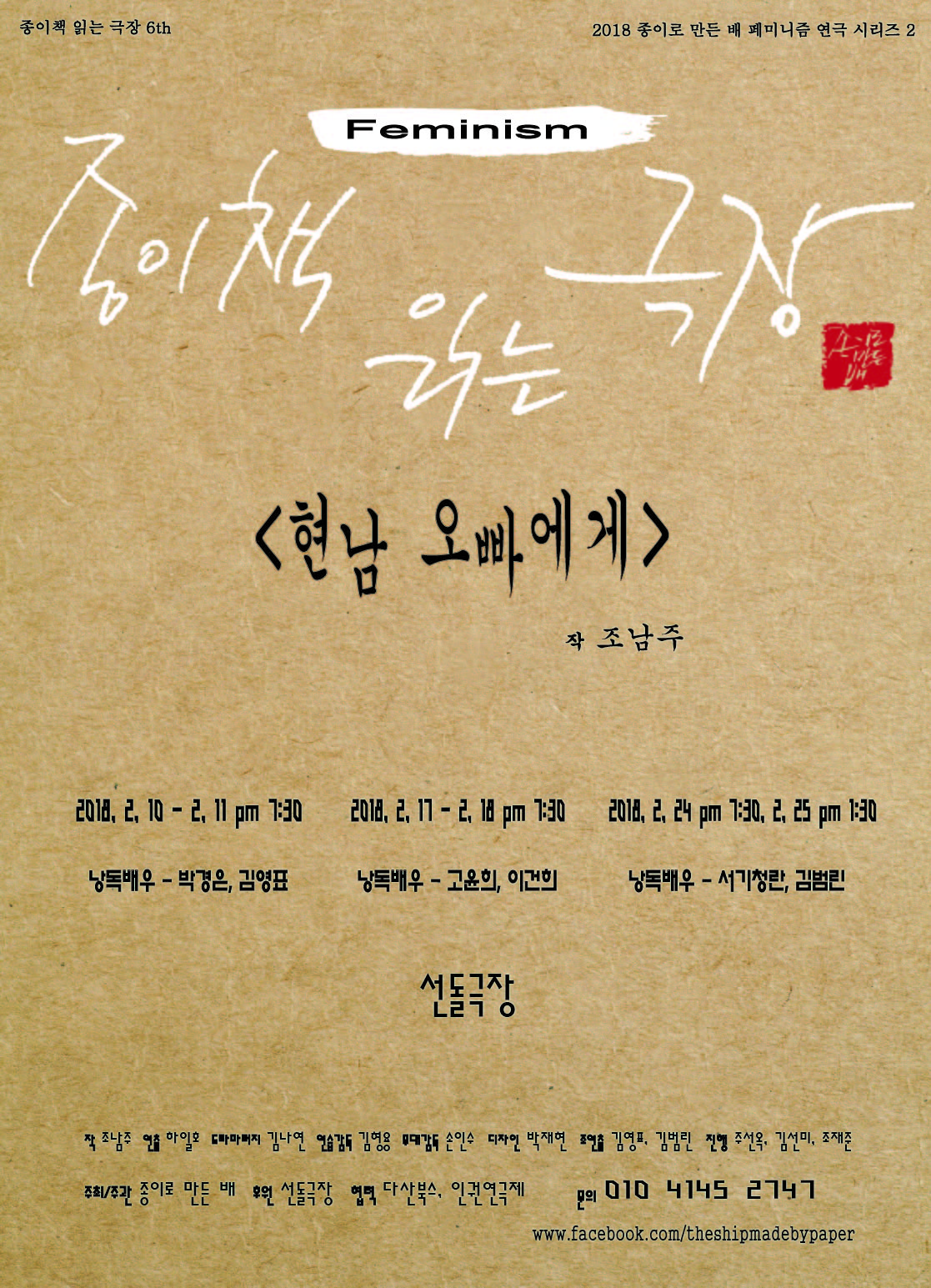 안녕하세요! 극단 종이로 만든 배 입니다. 저희 극단에서 2018년 일련의 폐미니즘 연극을 기획하고 있습니다. 그 두번째 프로젝트로 준비하고 있는 낭독공연 한 편 소개합니다. 극단에서 2018년도 두번째 페미니즘 작품으로 나서는 <현남 오빠에게>는 극단에서 매년 진행하고 있는 입체낭독공연 <종이책 읽는 극장의 여섯 번째 무대>로 ‘페미니즘’을 주제로 선정한 작품이다. 다산책방에서 펴낸 최초의 페미니즘 소설집 「현남 오빠에게」에 수록된 “82년 김지영의 작가” 조남주의 표제작품이다. 10년간 사귀던 남자로부터 ‘무례한’ 청혼을 받아든 한 여성이 그것을 계기로 지난 10년간의 과거를 되돌아보며 자신과 그의 관계를 성찰하는 내용을 담아낸 작품이다. 영상과 음악아래 단편 소설 전편을 배우가 읽어주는 ‘입체낭독공연’ 형식으로 진행되며 전석 무료공연이다. <권력에 맞서 진실을 외쳐라!>에서 뭉클한 감성의 연기를 보여준 극단의 대표 배우 박경은, 강한 집중력과 세련된 감수성의 소유자 고윤희 배우 그리고 선명한 지성을 품고 있는 배우 서기청란 등이 낭독한다. 제목 <현남 오빠에게_조남주 작> 종이책 읽는 극장 6 _페미니즘_ 작 조남주 연출 하일호 출연 박경은, 고윤희, 서기청란, 김영표, 김범린, 이건희 공연날짜 2018년 2월 10일, 11일/17일, 18일/24일, 25일 공연시간 19시 30분(단, 2월 25일 공연을 13시 30분에 공연) 공연장소 선돌극장 전석 무료공연문의 010 4145 2747 주최주관 종이로 만든 배, 후원 선돌극장, 협력 다산북스, 인권연극제
