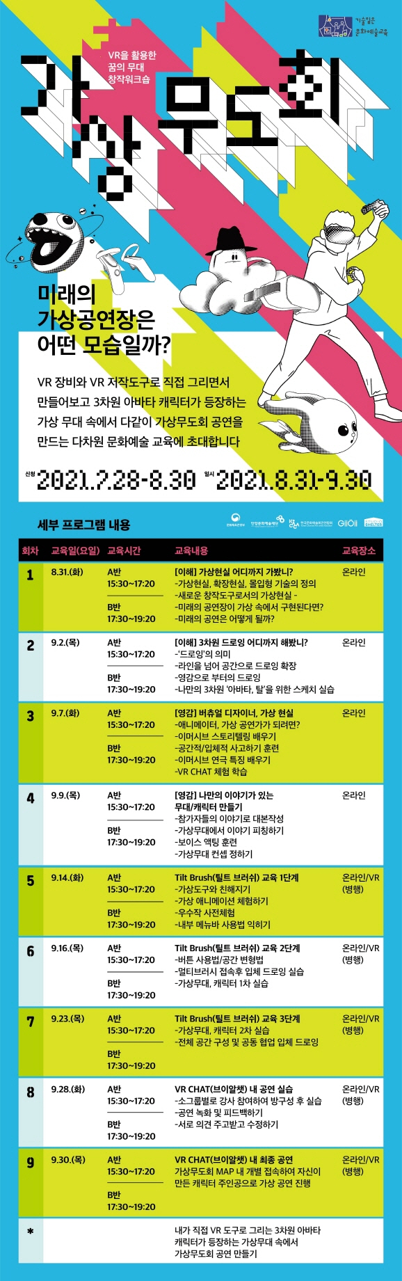 VR 창작 도구 퀼을 활용하여 참여자들이 가상 세계 속에서 공연장(무대)을 직접 디자인하고 교육을 통해 학습한 스토리텔링 기법으로 인물을 제작하며 최종적으로 애니메이션을 영화제 출품하는 등, 변화하는 시대에 맞는 문화예술 프로그램입니다.
