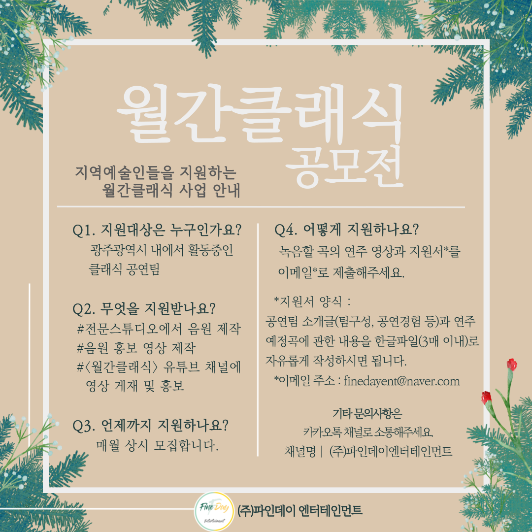 월간클래식은 광주 지역 예술인들이 가지고 있는 역량을 발휘하고, 이를 홍보하는 데 사용할 수 있도록 연주 음원 한곡과 영상 한편을 제작 지원하는 사업입니다.