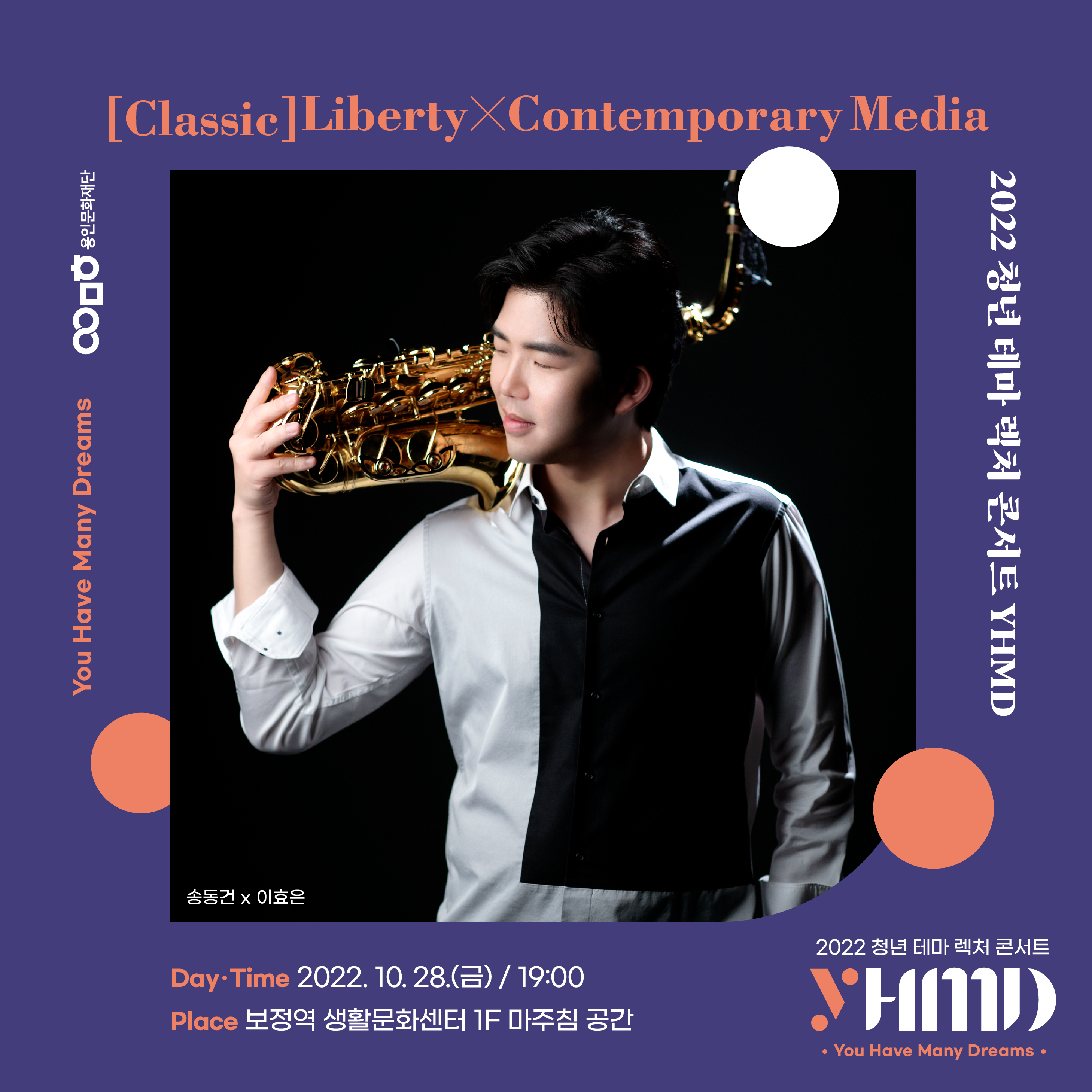 2022 보정역 생활문화센터 청년 테마 렉처 콘서트 YHMD; You Have Many Dreams ☆ 청년의 다양한 감정을 음악으로 들여다보다 기쁨과 슬픔, 사랑과 이별, 그리고 환희와 비탄. 청년의 삶, 다양한 감정들이 공존하고 있습니다. 비단 이 시대와 공간의 이야기만은 아닐 거예요. 19세기부터 현대까지, 시대와 환경은 다르지만 무언가를 갈망하는 청년의 마음은 그 시간 속에서 가장 젊었습니다. 가장 뜨겁고 신선한 청년의 생각을 다양한 음악과 함께 만나보세요. ☆ 10월 [Liberty] 송동건 x 이효은 격변의 20세기, 그리고 다양성의 21세기. 언어는 달라도 각자의 다양한 방법으로 자신들의 의견과 생각을 자유롭게 펼친, 가장 젊은 청년의 시대. 애니메이션, 영화, 뮤지컬 등 다양한 미디어에서 나타난 청년들의 목소리를 음악과 함께 들으며 공감해봅니다. ㅇ 일시/장소 : 2022. 10.. 28.(금) 19:00 / 보정역 생활문화센터 1F (경기도 용인시 기흥구 용구대로 2585) ㅇ 출연 : 송동건(Saxophone), 이효은(Piano) ㅇ 참여신청 - 참여대상 : 만18세 이상 ~ 39세 이하 시민 50명 내외 (용인시 및 인근 거주자 우대) - 신청방법 : 네이버폼을 통한 사전 신청(https://naver.me/xScVeLgF) / 2022. 10. 4.(화) ~ 10. 25.(화) ※ 주차 장소가 협소한 관계로, 공연 당일 대중 교통 이용을 권장드립니다.