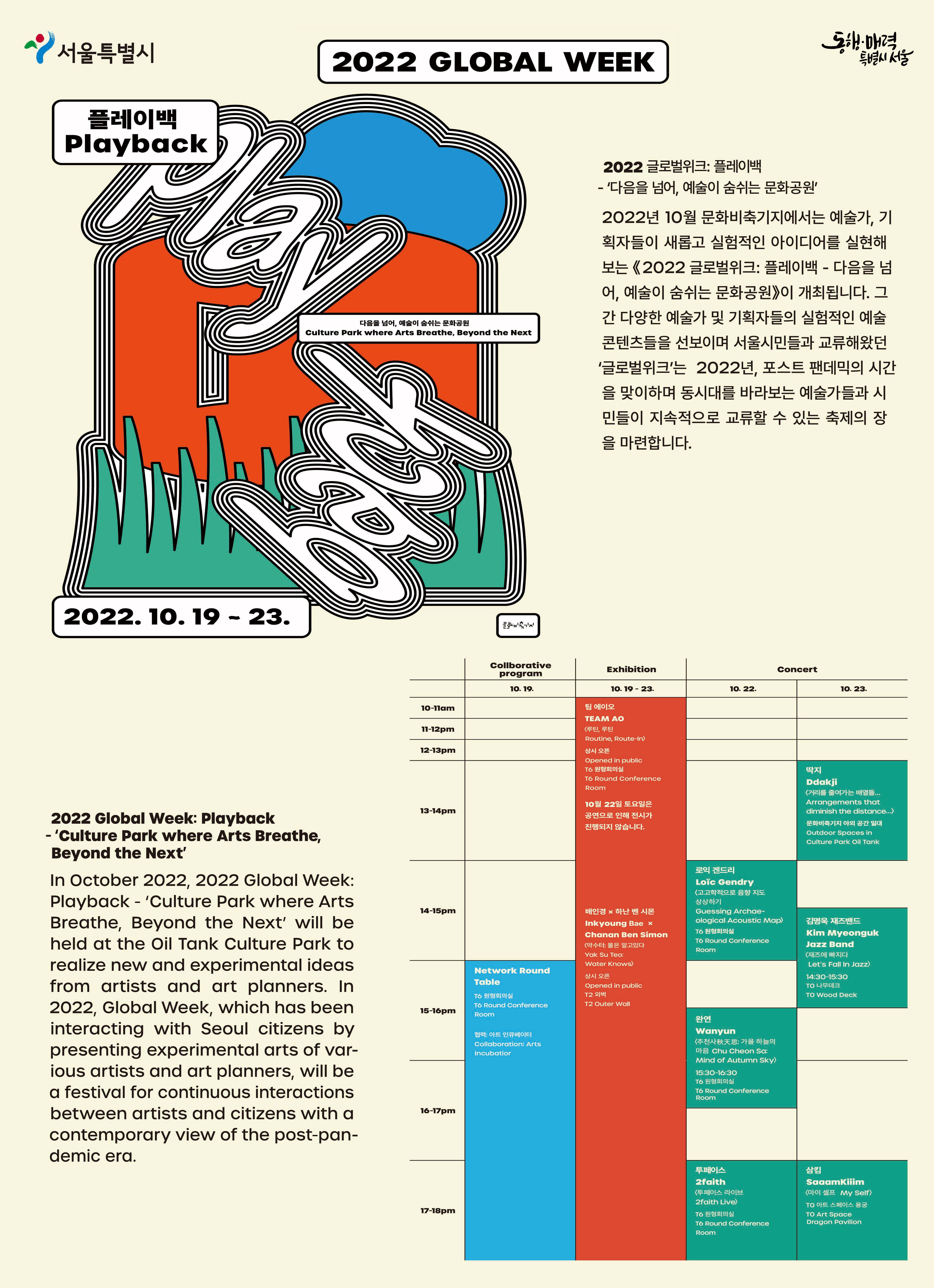 가을날에 잘 어울리는 아름다운 스탠다드재즈 음악. 김명욱 재즈밴드는 화려한 즉흥연주와 즐거운 리듬, 보컬과 악기들의 하모니를 이루며 관객들과 소통한다. 영화 OST나 대중적으로 많이 알려져 있는 음악을 편곡하여 가을 낮, 편안한 공연으로 시민들과 함께하는 시간을 가진다.