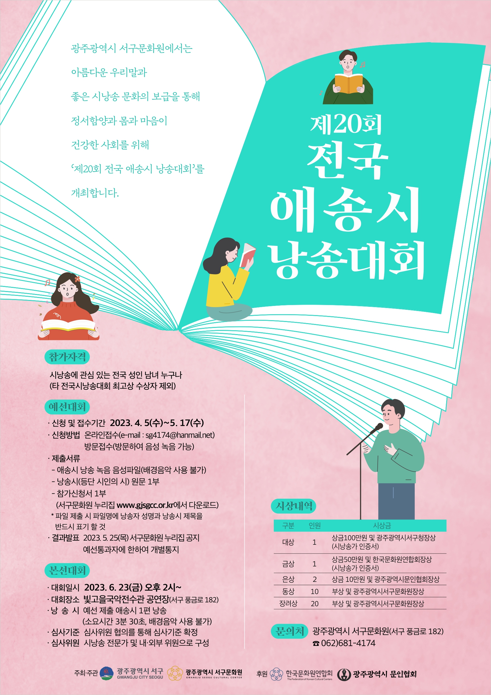 *참가자격 ·시낭송에 관심 있는 전국 성인 남녀 누구나 (타 전국시낭송대회 최고상 수상자 제외) *예선대회 ·신청 및 접수기간 – 2023. 4. 5(수) ~ 5. 17(수) ·신청방법 – 온라인 접수(e-mail : sg4174@hanmail.net) 방문접수(방문하여 음성 녹음 가능) ·제출서류 -애송시 낭송 녹음 음성파일(배경음악 사용 불가) -낭송시(등단 시인의 시) 원문 1부 -참가신청서 1부 (서구 문화원 누리집 www.gjsgcc.or.kr 에서 다운로드) (파일 제출 시 파일명에 낭송자 설명과 낭송시 제목을 반드시 표기할 것) ·결과발표 -2023년 5. 25(목) 서구문화원 누리집 공지 -예선통과자에 한하여 개별통지 *본선대회 ·대회 일시 – 2023. 06. 23(금) 오후 2시~ ·대회 장소 – 빛고을국악전수관 공연장(서구 풍금로 182) ·낭 송 시 예선 제출 애송시 1편 낭송 (소요시간 3분 30초, 배경음악 사용 불가) ·심사 기준 – 심사위원 협의를 통해 심사기준 확정 ·심사 위원 – 시낭송 전문가 및 내·외부 위원으로 구성 구분 | 인원 | 시상금 | 대상 | 1 | 상금 100만원 및 광주광역시 서구청장 상 (시낭송가 인증서) | 금상 | 1 | 상금 50만원 및 한국 문화원 연합 회장 상 (시낭송가 인증서) | 은상 | 2 | 상금 10만원 및 광주광역시 문인협 회장 상 | 동상 | 10 | 부상 및 광주광역시 서구문화원장 상 | 장려상 | 20 | 부상 및 광주광역시 서구문화원장 상 | *시상 내역 *문의처 ·광주광역시 서구문화원(서구 풍금로 182) ☎062)681-4174