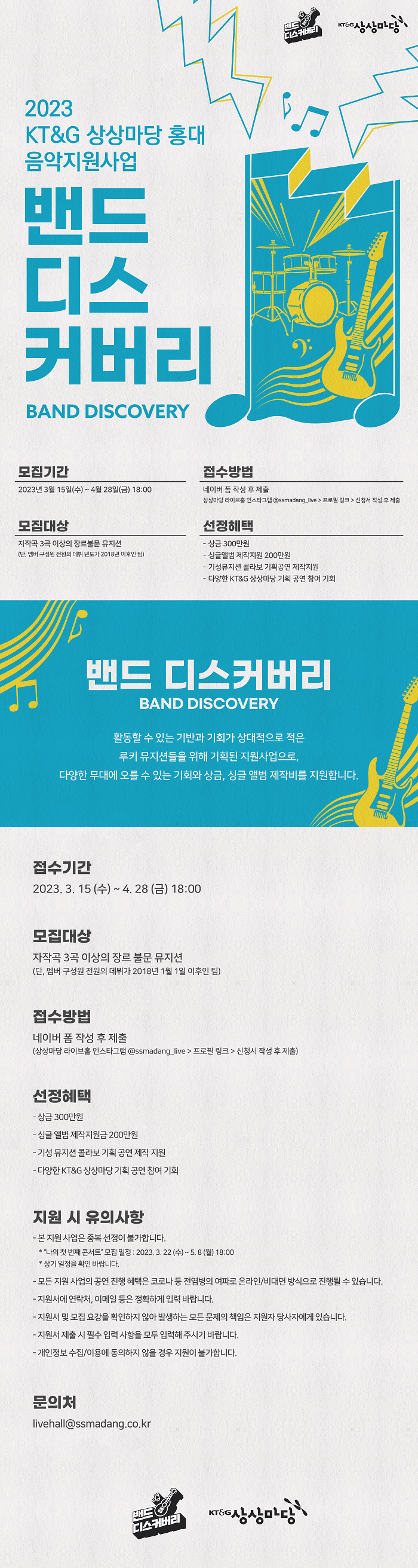 🎸 2023 KT&G 상상마당 홍대 음악지원사업 ‘밴드 디스커버리’🎸 ⠀ 다양한 문화를 이끌어나가는 KT&G 상상마당과 함께할 루키 뮤지션을 찾습니다! ⠀ ✅ 접수 일정 2023년 3월 15일(수) - 4월 28일(금) 18:00 ⠀ ✅ 지원 혜택 - 상금 300만원 - 싱글 앨범 제작 지원 200만원 - 기성뮤지션 콜라보 기획공연 제작지원 - 다양한 KT&G 상상마당 기획 공연 참여 기회