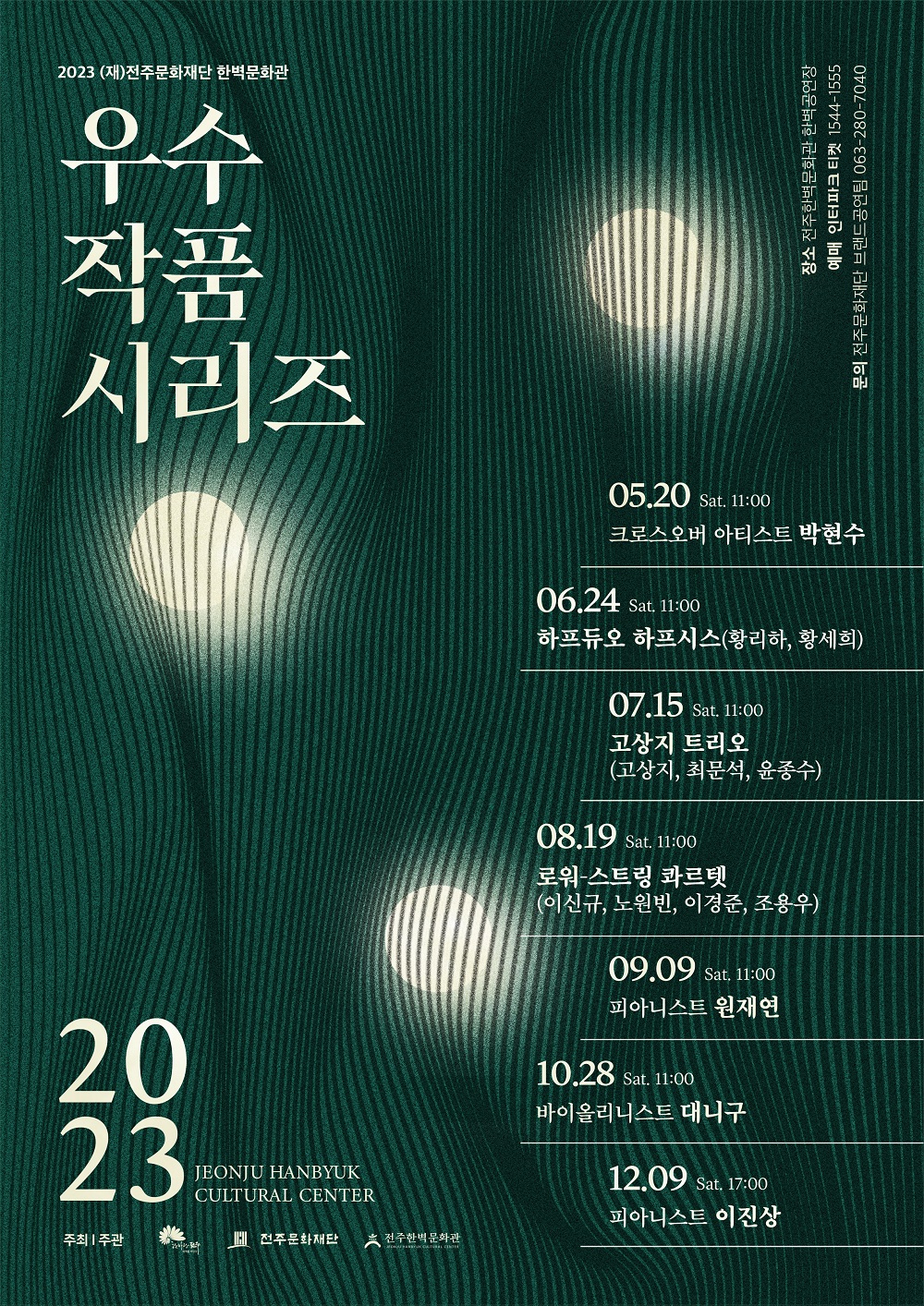 일시 : 2023. 5. 20.(토) ~ 10. 28.(토) 11:00 12. 9.(토) 17:00 ※공연별 일자 상이 장소 : 전주한벽문화관 한벽공연장 관람료 : 전석 2만원 문의 : (재)전주문화재단 브랜드공연팀 063-280-7040 예매 : 인터파크 티켓 https://tickets.interpark.com/search?keyword=2023%20%EC%9A%B0%EC%88%98%EC%9E%91%ED%92%88%EC%8B%9C%EB%A6%AC%EC%A6%88