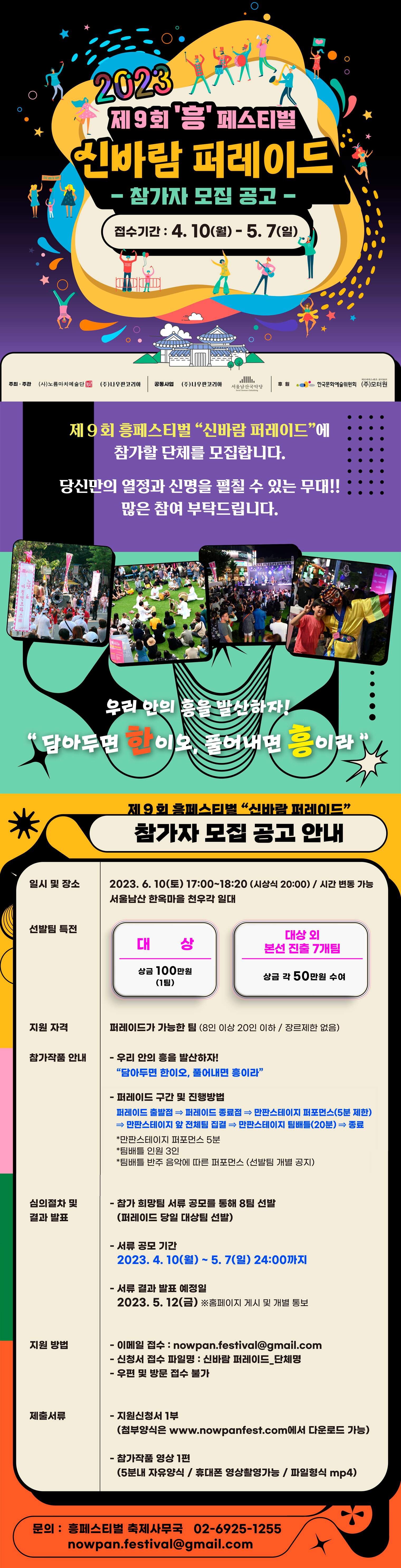 ■ 흥페스티벌_신바람 퍼레이드 참가자 모집 ☞접수기간: 2023년 4월 10일(월) ~ 5월 7일(일) 24:00까지 ☞서류 결과 발표 예정일: 2023년 5월 12일(금) ※ 홈페이지 게시 및 개별 통보 ☞ 행사장소: 서울남산 한옥마을 천우각 일대 ☞ 행사일시: 2023. 06. 10(토) 17:00 ~ 18:20 (시상식 20:00) - 시간 변동 가능 ☞ 상금: 대상 100만원 (1팀) 대상 외 본선 진출 7개팀: 상금 각 50만원 수여 ☞ 지원 자격: 퍼레이드가 가능한 팀 (8인 이상 20인 이하 - 장르제한 없음)